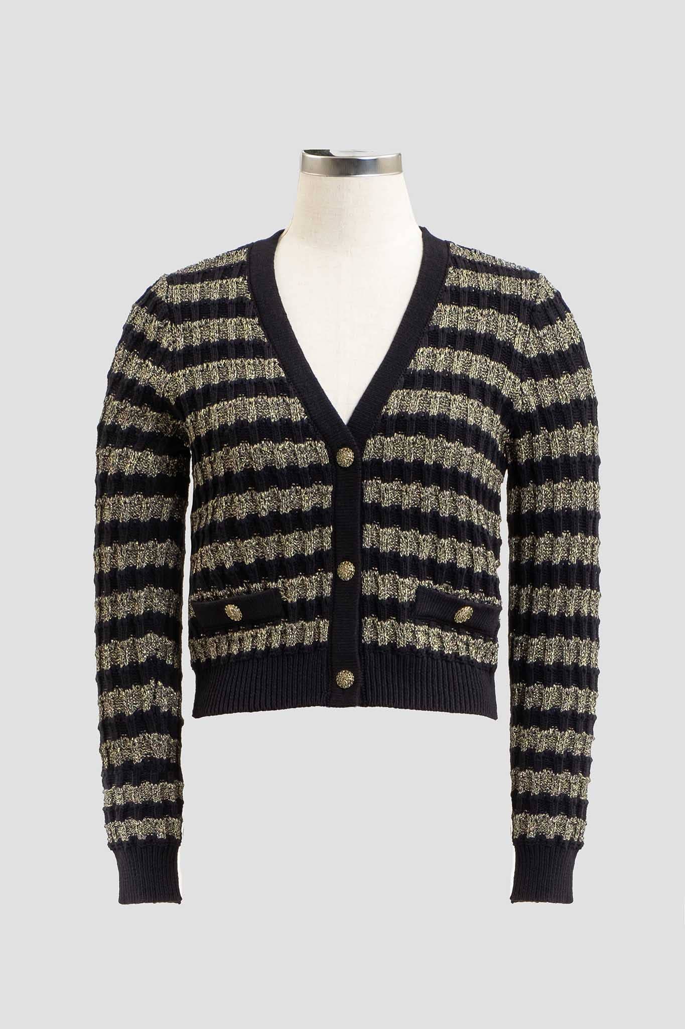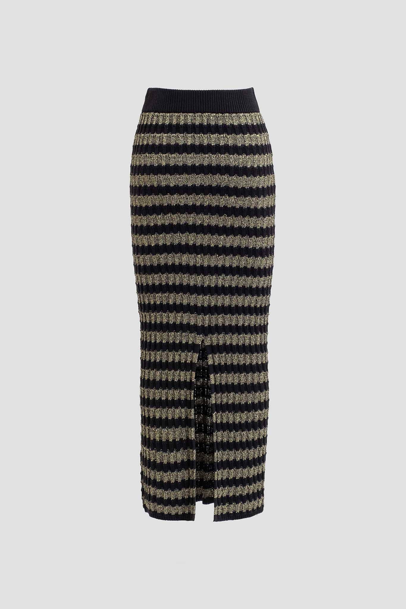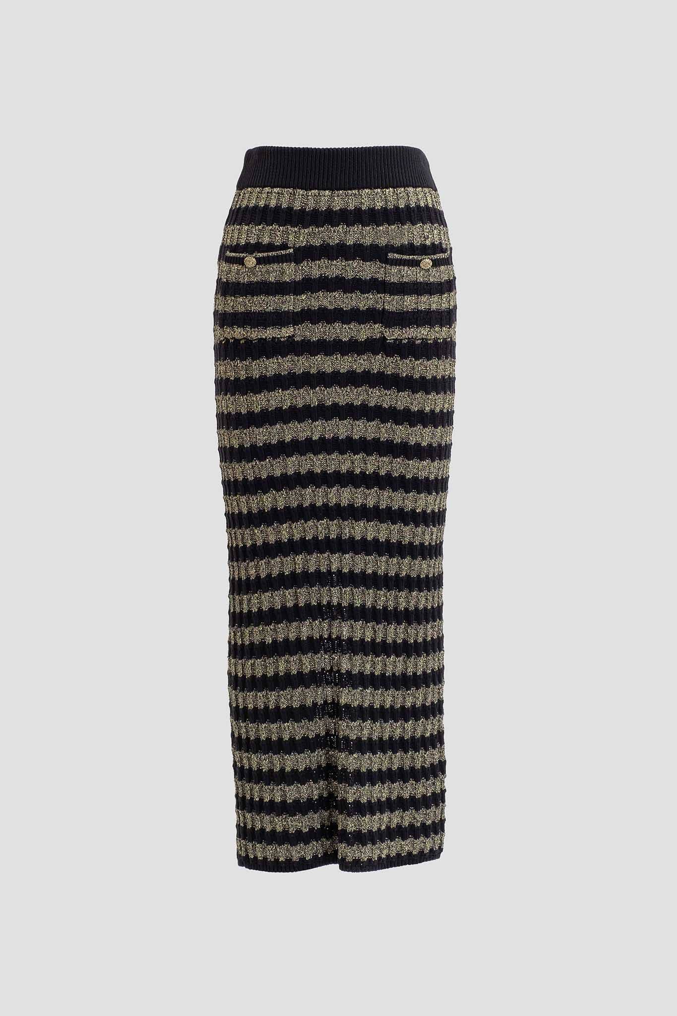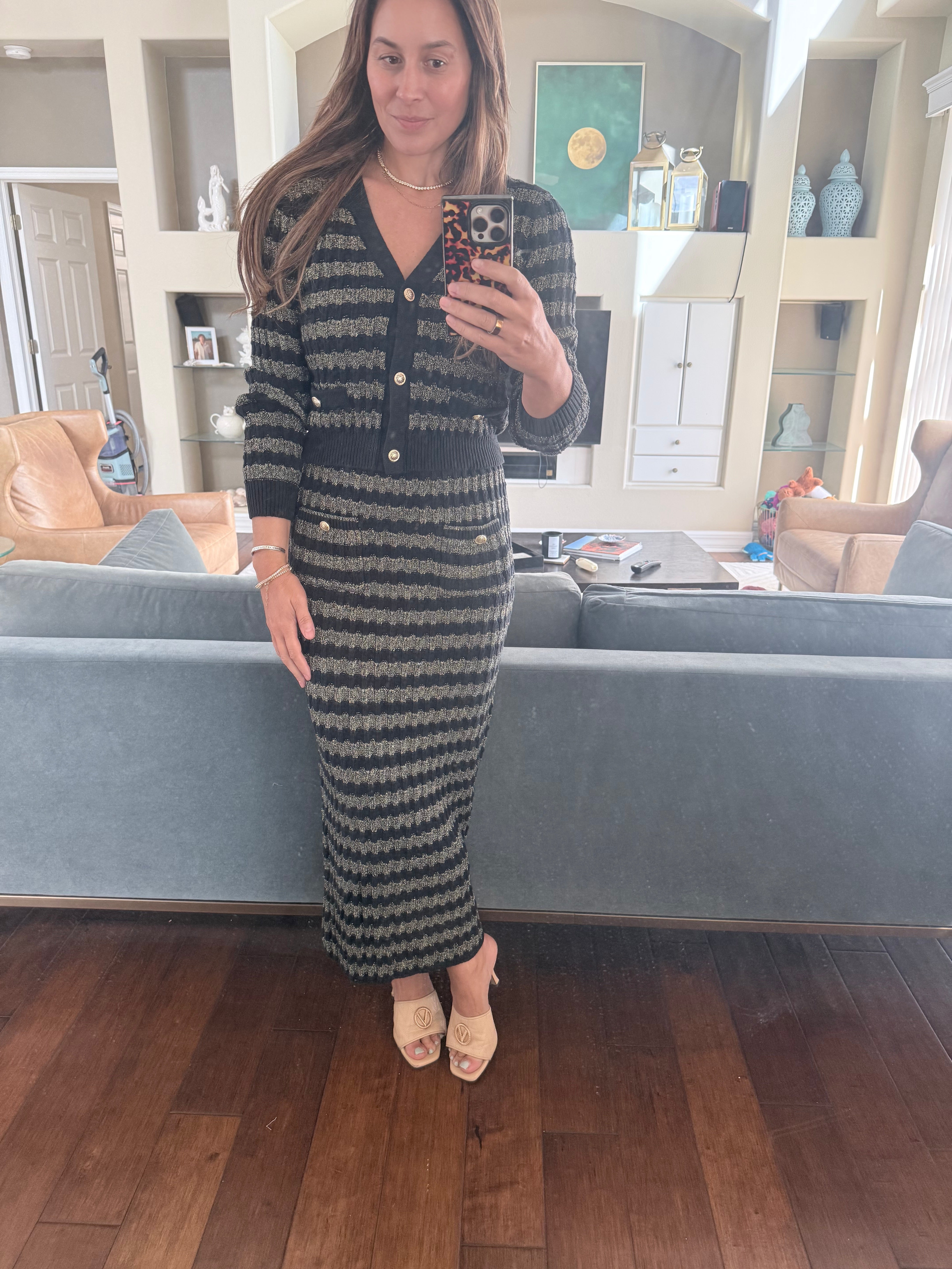 Inspired by the golden coastline of the French Riviera, the Côte d’Or Set is a study in effortless elegance. This two-piece knit features a softly structured cardigan and a sleek midi skirt, woven in rich black with luminous gold striping that catches the light beautifully. Polished gold-tone buttons and subtle pocket details add a tailored finish, while the ribbed knit drapes the body with an easy, flattering silhouette.