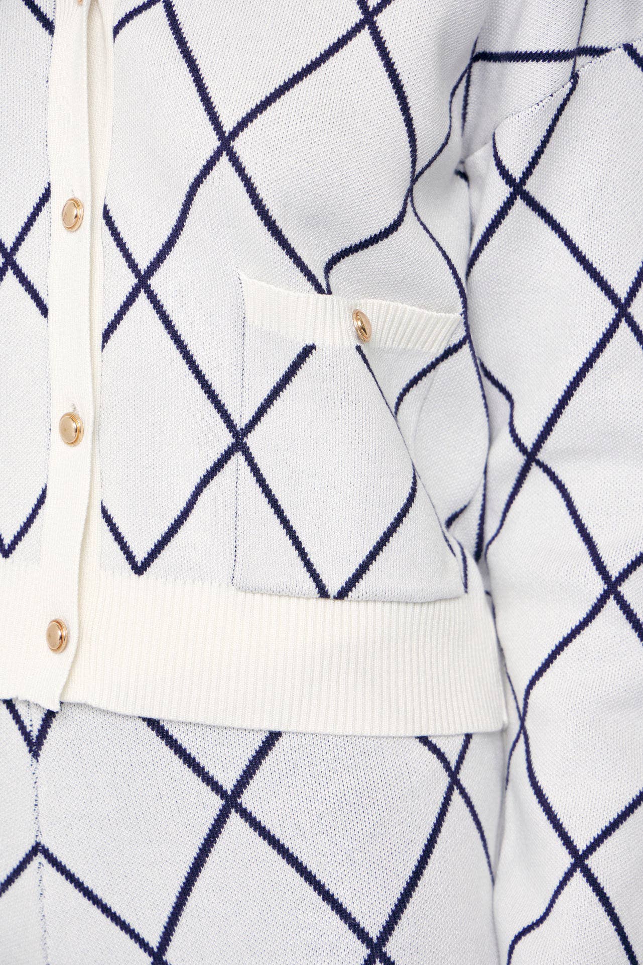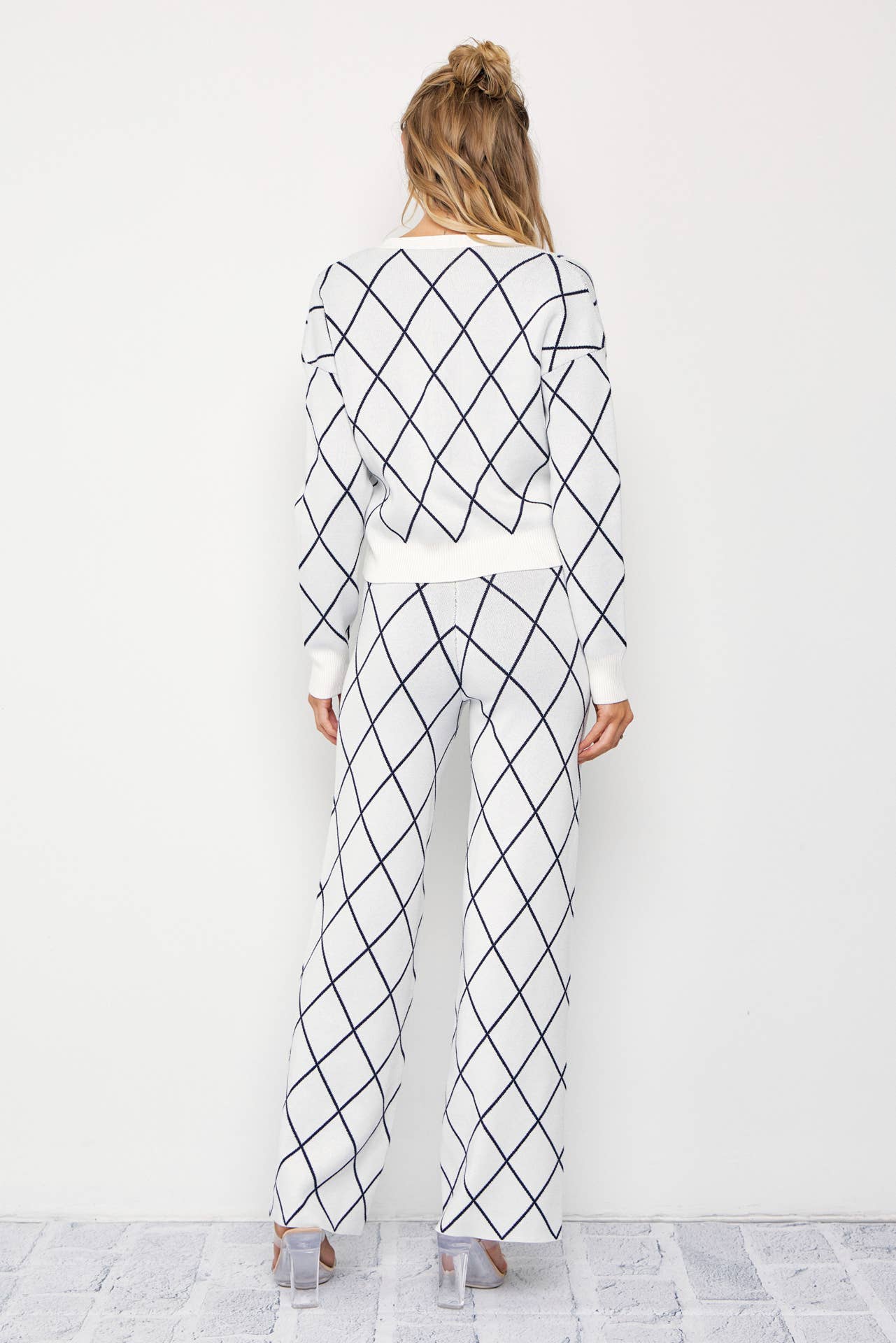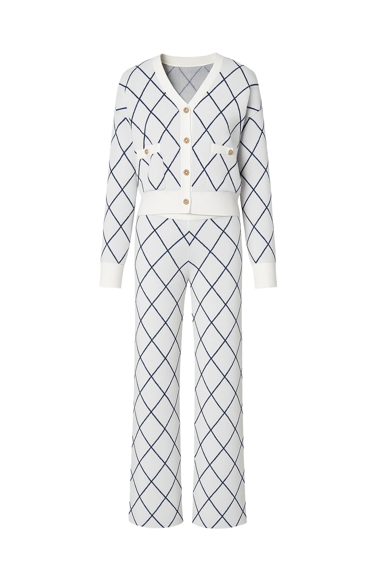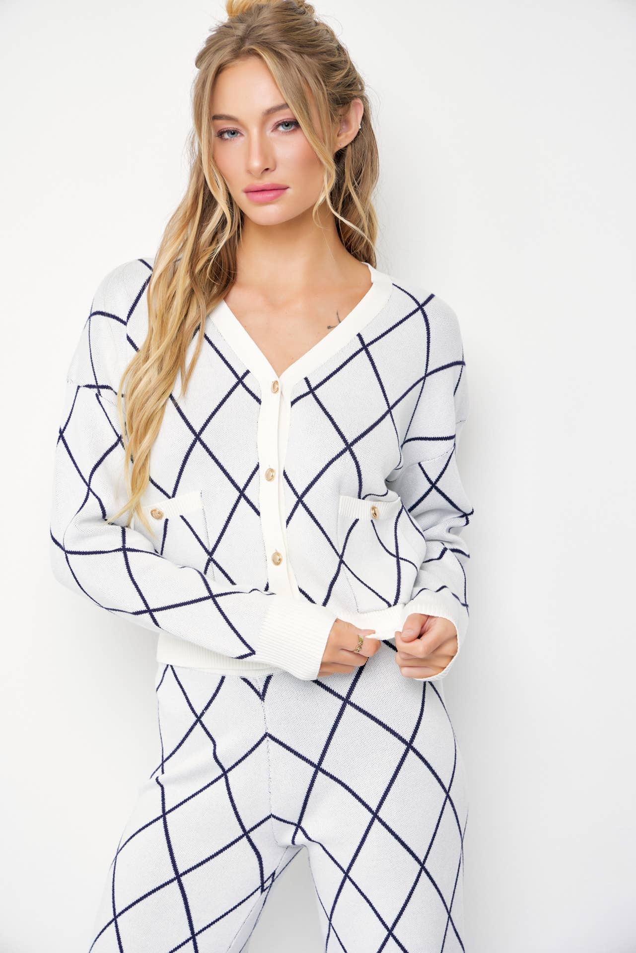 Clean lines meet effortless sophistication in the Tribeca Tailored Set. Crafted from 100% viscose, this refined two-piece features a sleek button-front cardigan with subtle pocket detailing, paired with fluid wide-leg trousers that drape beautifully. Finished in an ivory base with a navy windowpane pattern, the look is polished yet relaxed—capturing the understated elegance of downtown New York. Designed to move seamlessly from meetings to evenings out, this set delivers modern structure with timeless appeal. Style together for a confident, city-ready statement or wear separately for elevated everyday dressing.