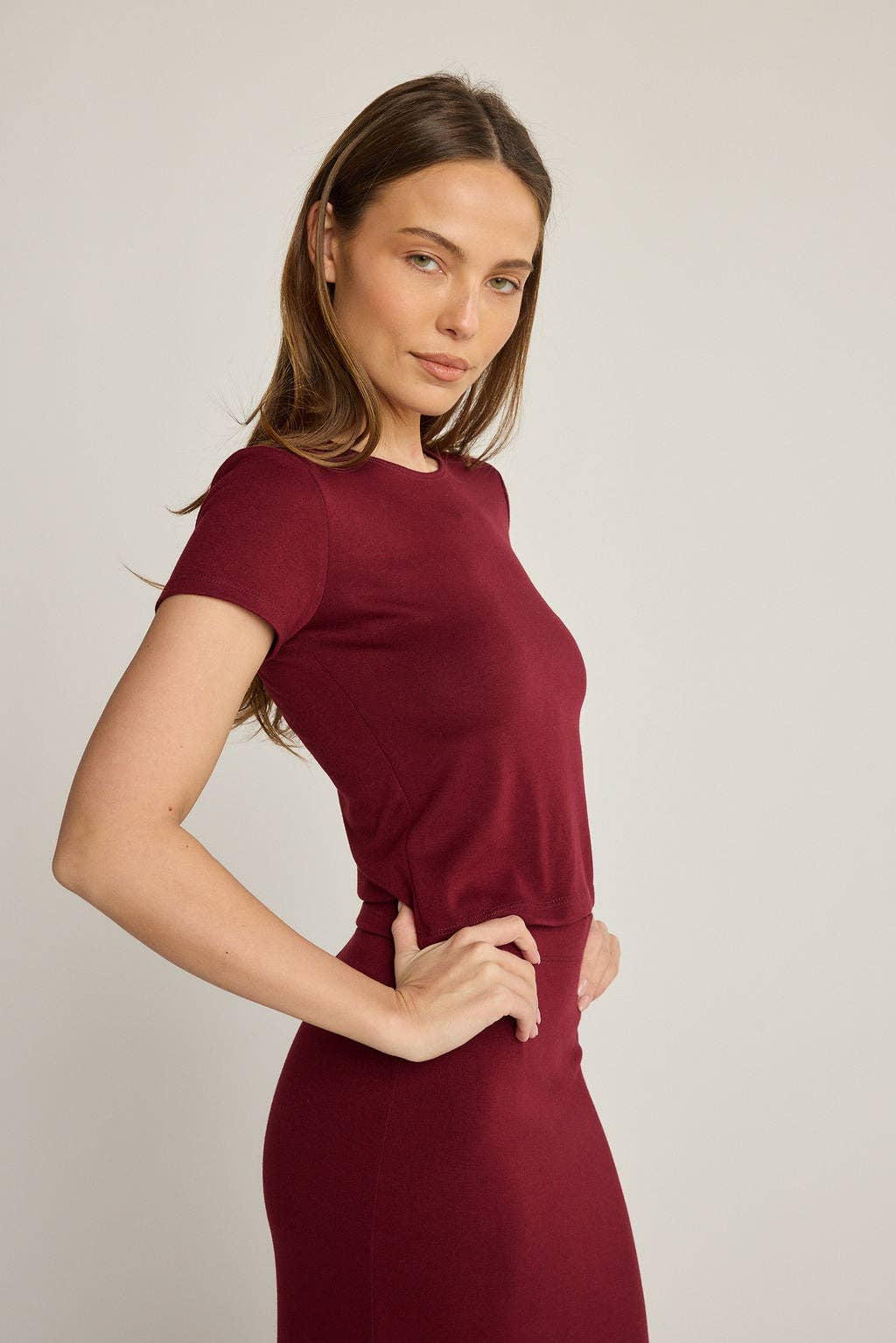 The Elise tee is your go-to essential, crafted from the softest fabric for a flattering fit that feels as good as it looks. Designed with a classic crew neck and a slightly cropped silhouette. This versatile tee can be layered with the Elise Cardigan or worn solo.