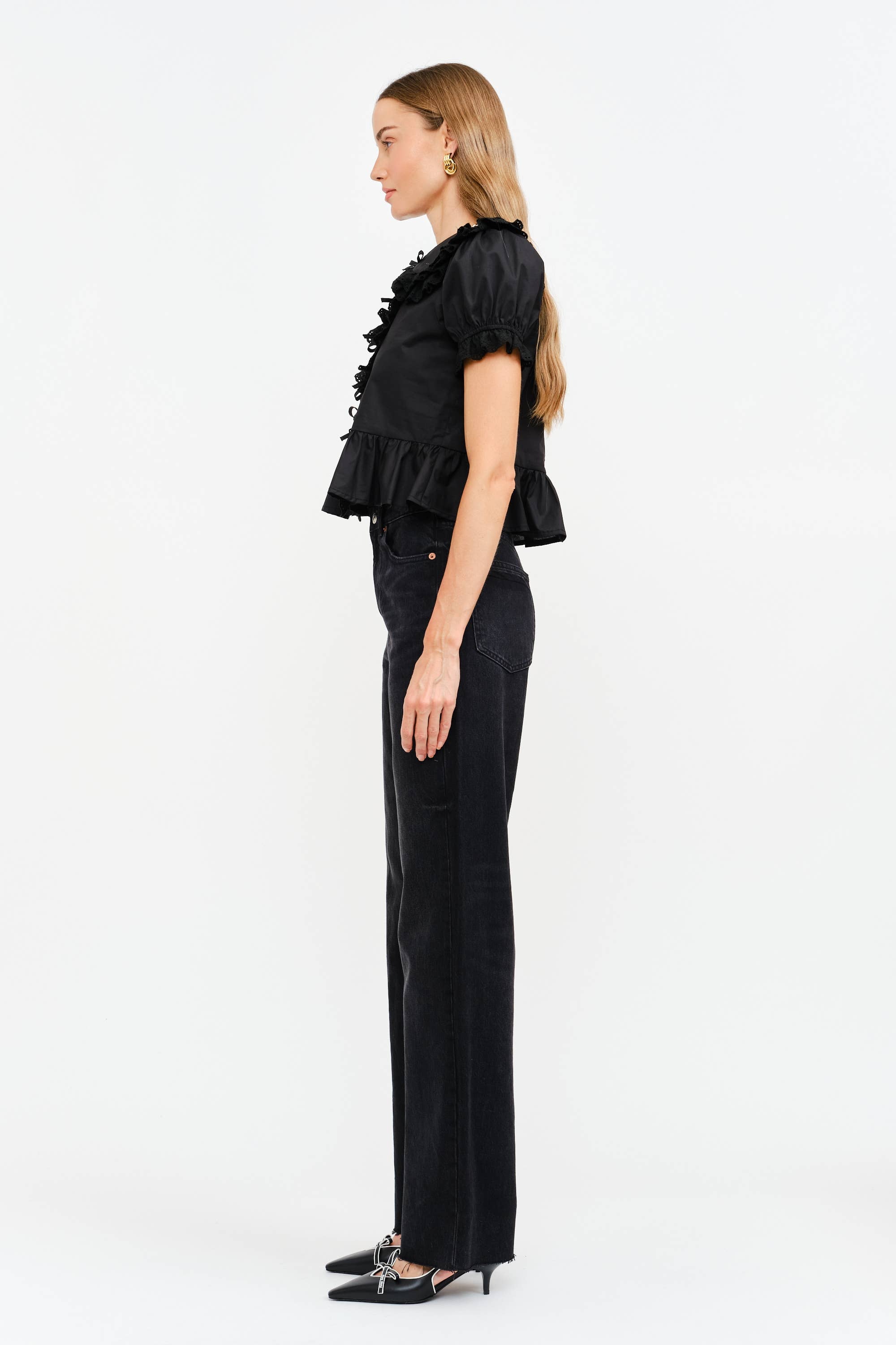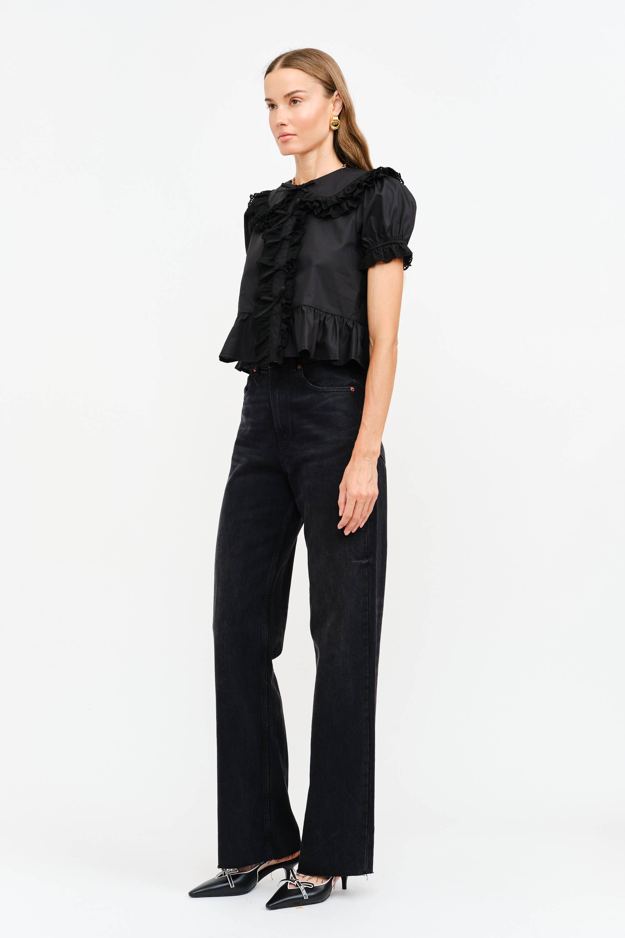 The Gianna Blouse Sweet with a hint of drama, this ruffled peplum top blends vintage structure with playful volume. Designed with cascading ruffles down the front and at the collar, it features puffed short sleeves, a gathered hemline, and dainty trim for added charm. The slightly cropped length makes it perfect for high-waisted denim or a flared midi skirt. - Cascading front ruffle detail - Peter Pan collar with trim - Peplum hem - Puff sleeves with ruffle cuff - Button-front closure Care Instructions: - Hand wash cold - Do not bleach - Line dry - Iron low if needed - Do not tumble dry Model is 5`11" and is wearing a size small