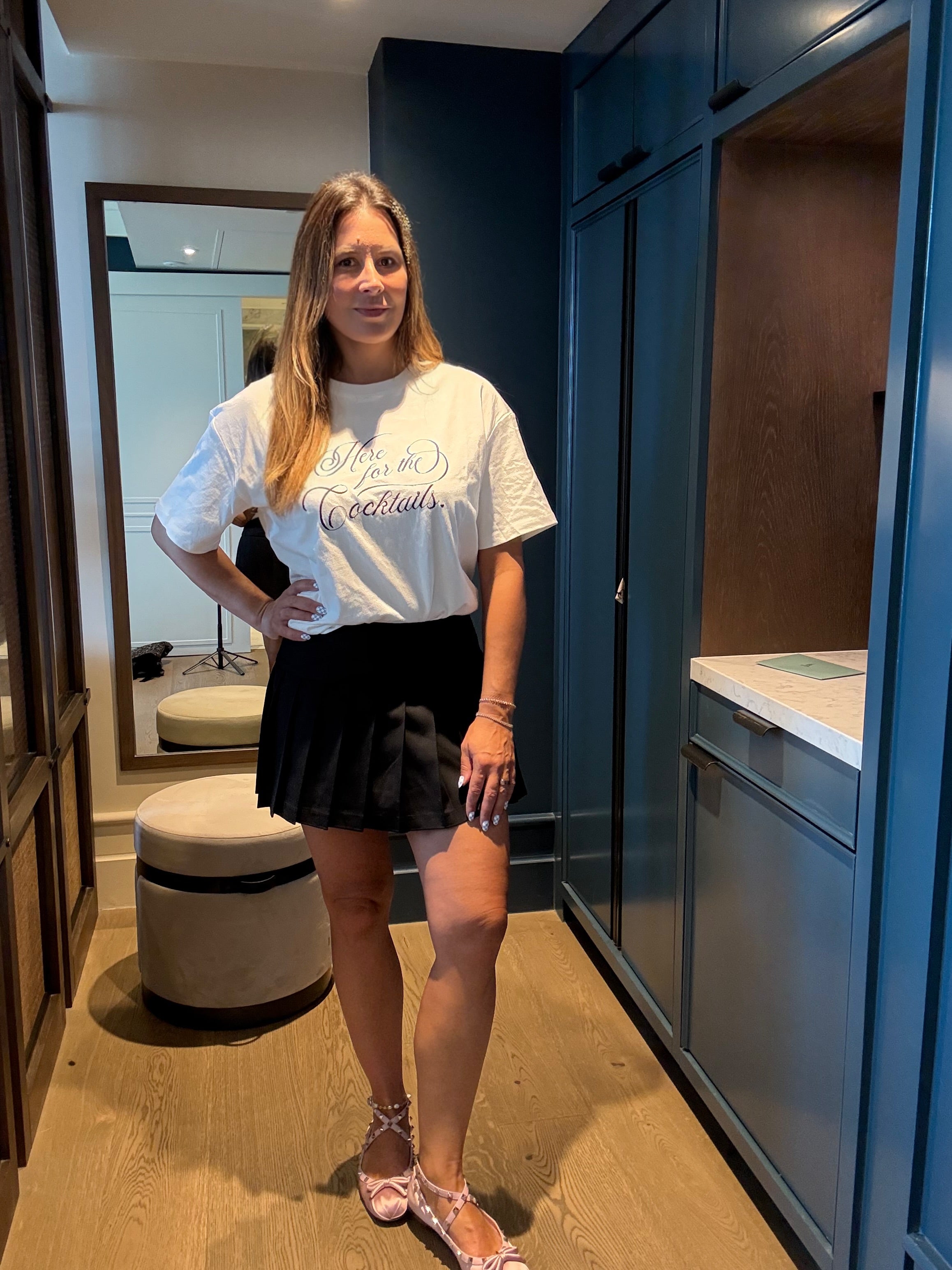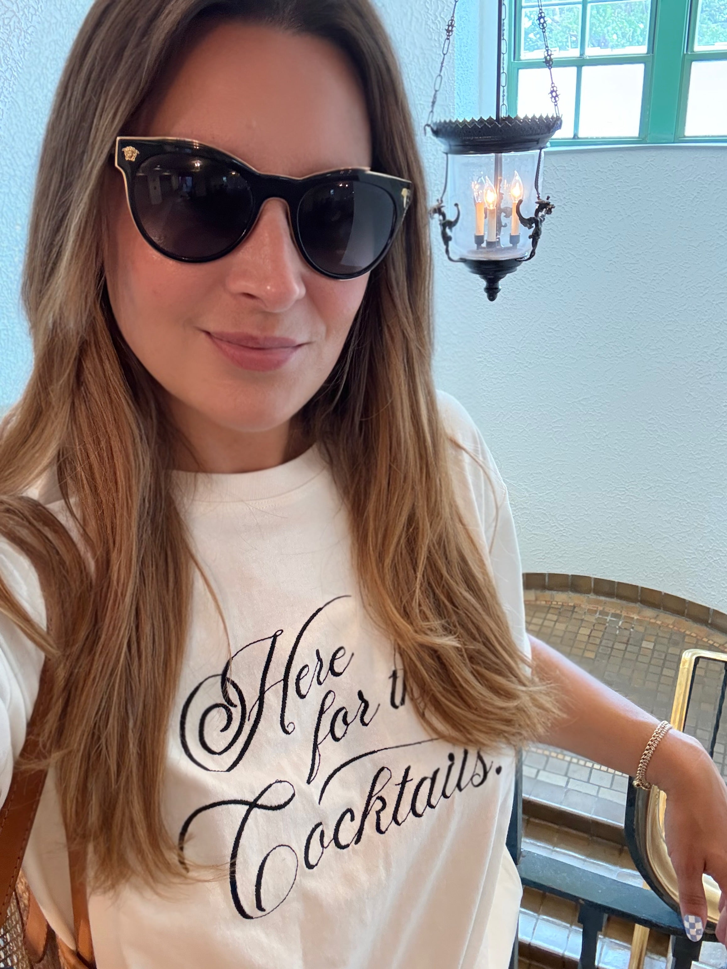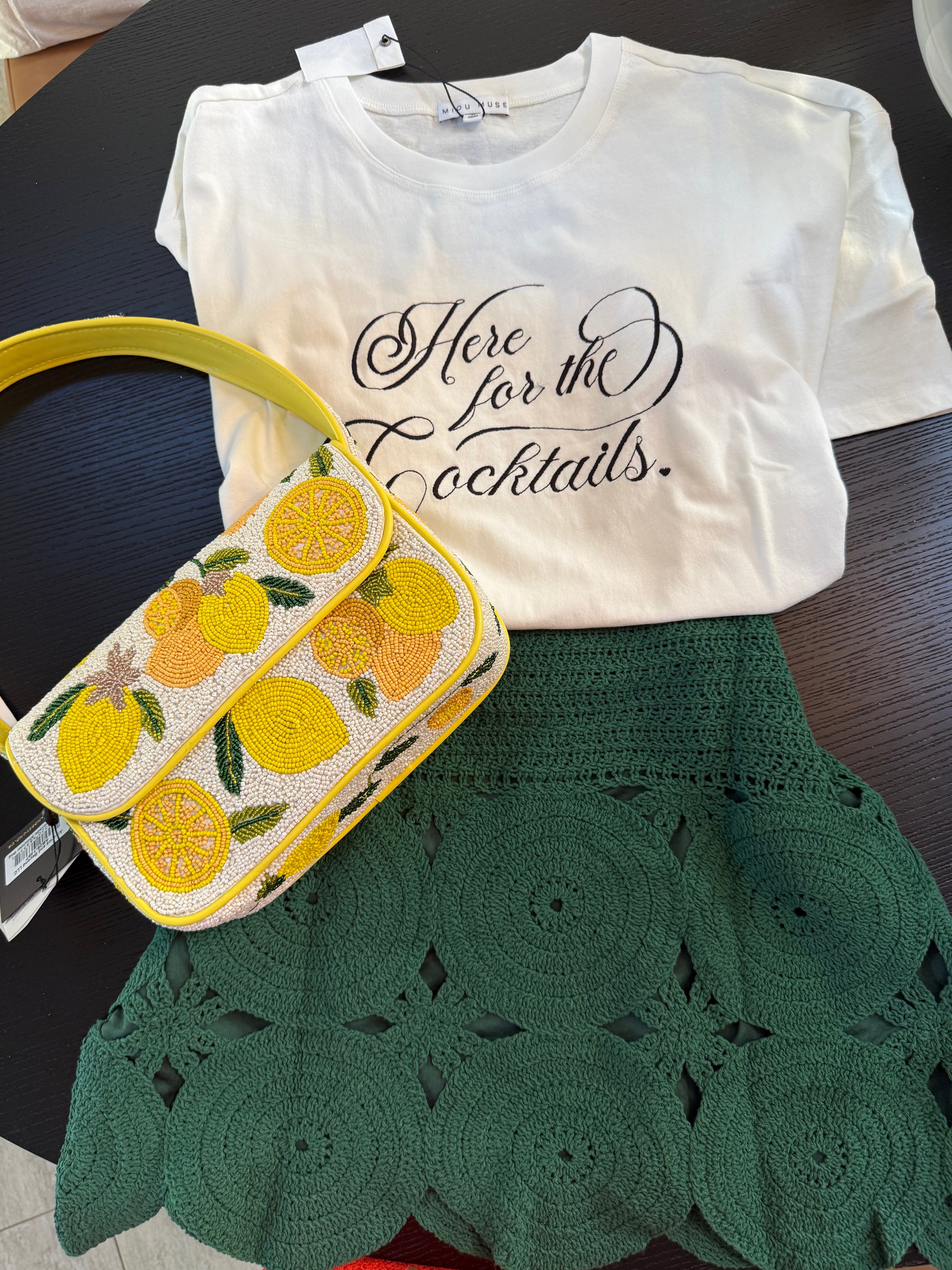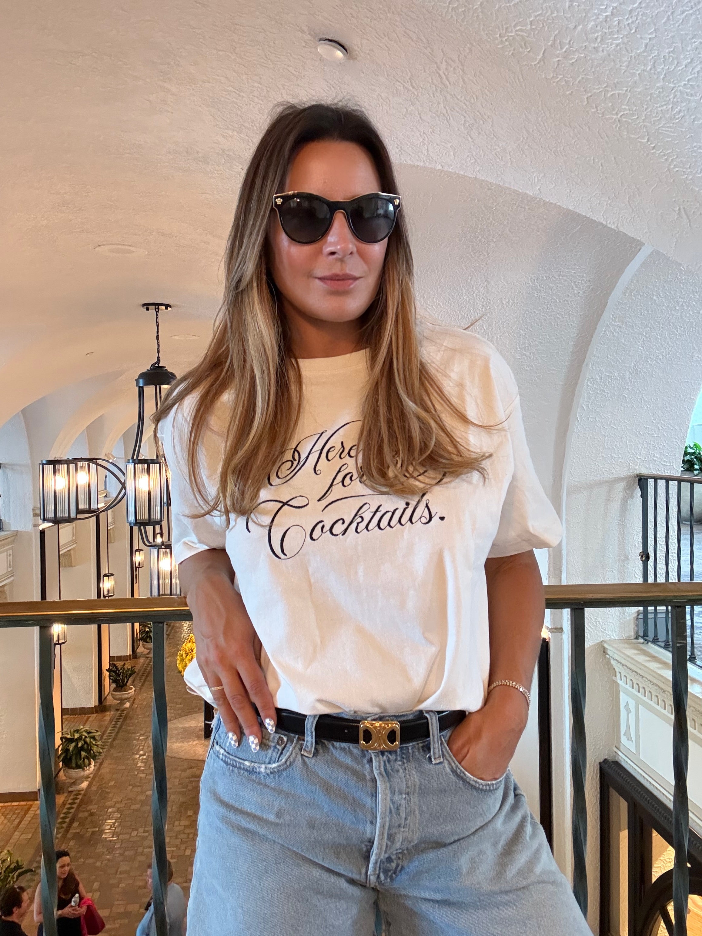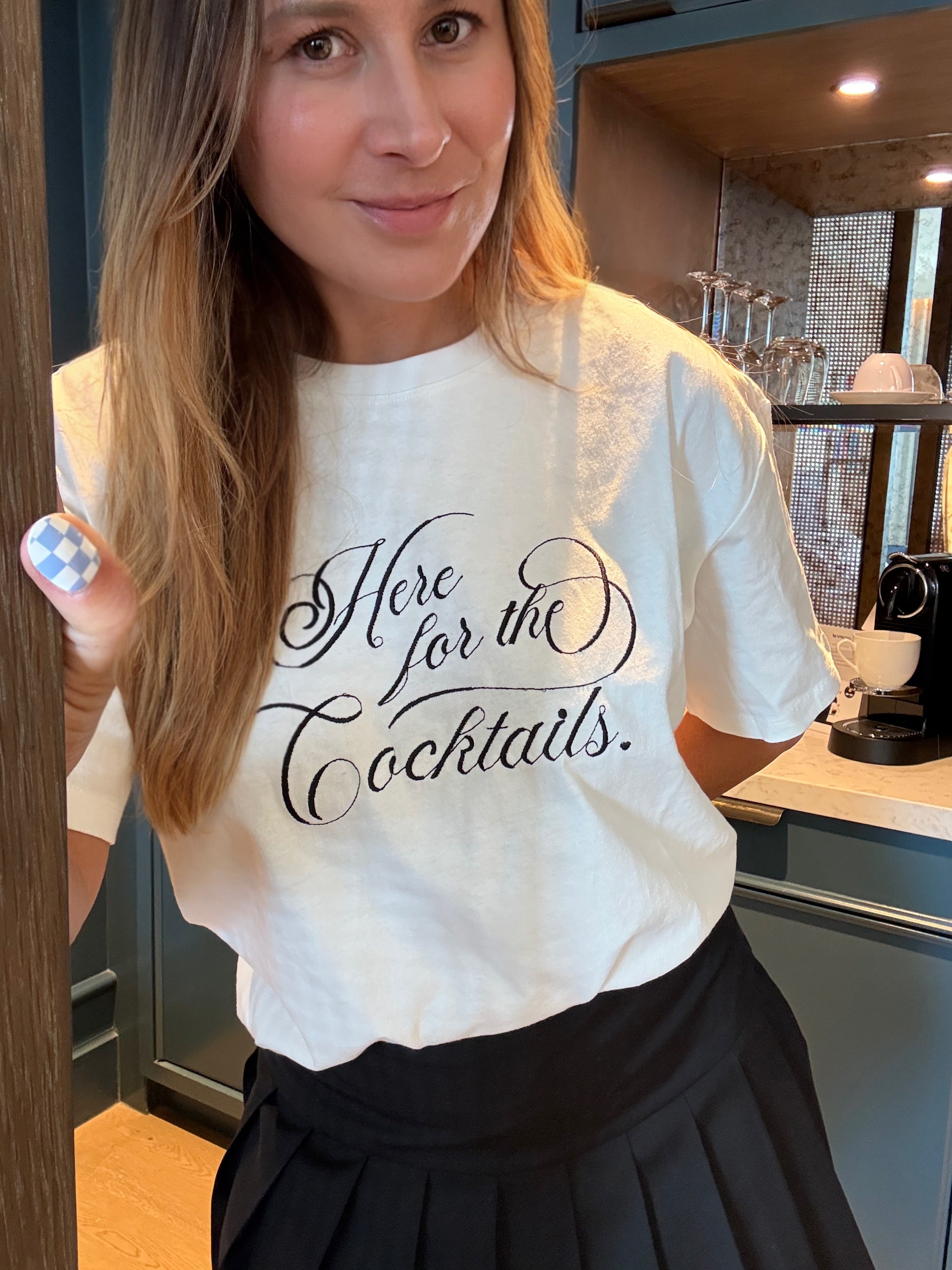 Weekend plans? Sorted. Our ‘Here for the Cocktails’ tee serves up effortless style with a cheeky twist—perfect for brunch, happy hour, or any moment worth toasting to. Embroidered with your announcement - Here for the cocktails.