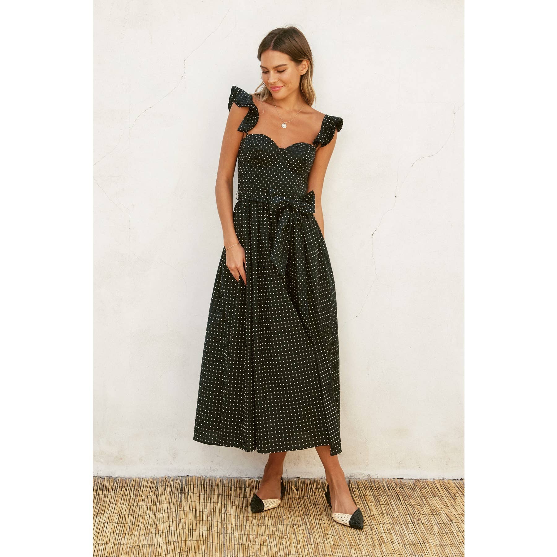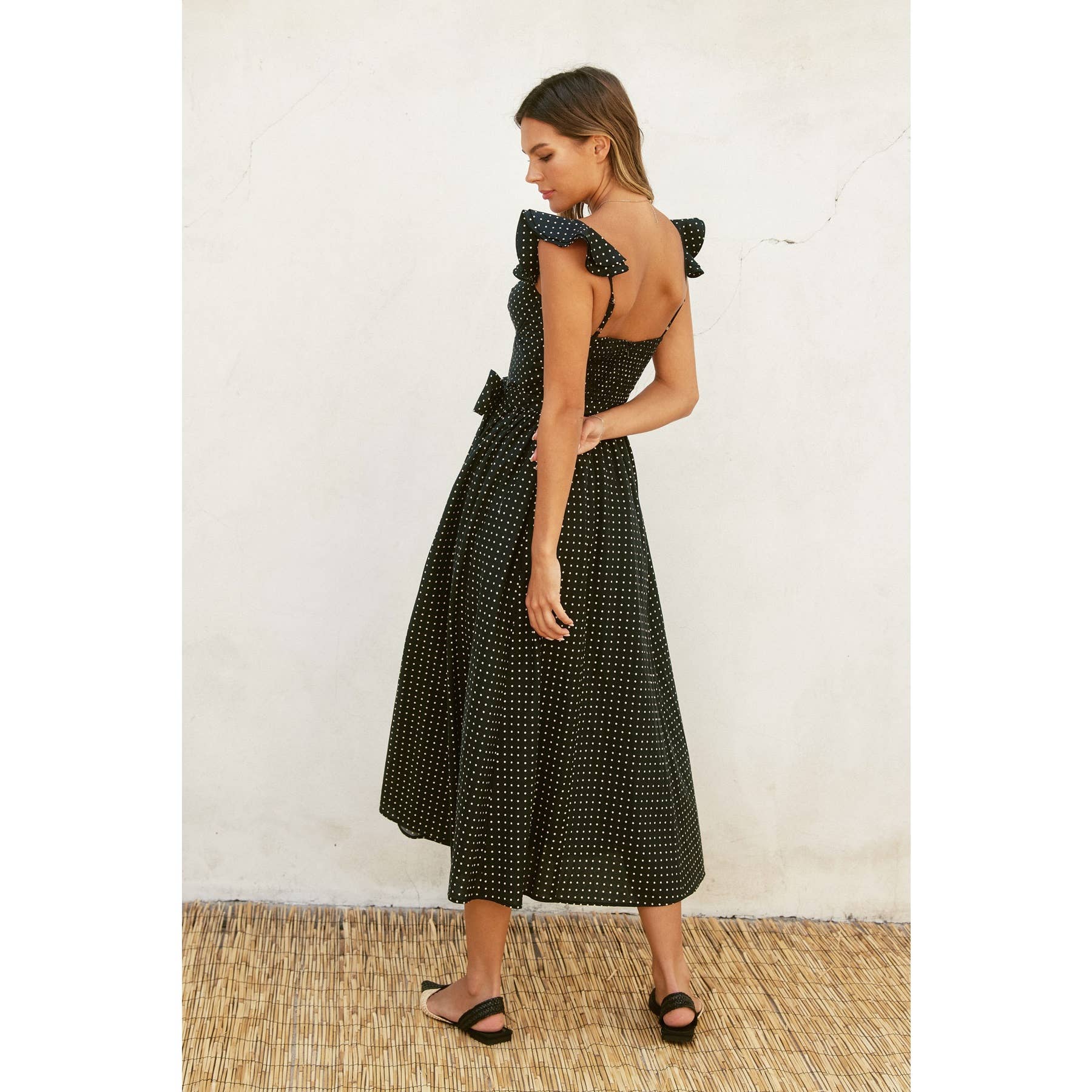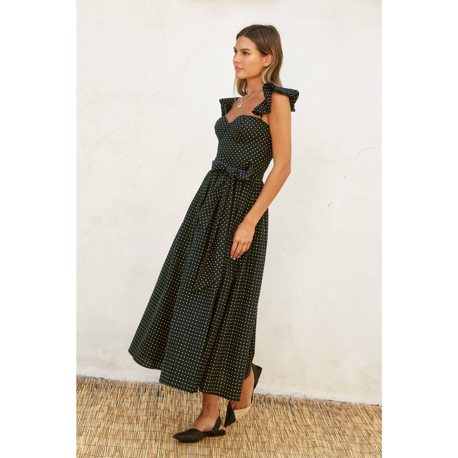 Pin dot print maxi dress featuring a corset top and flutter sleeves. Model is 5'8" and wearing size Small. - Corset top with padded cups - Flutter adjustable shoulder straps - Side front slit - Detachable waist tie - Exposed back zipper closure - Smocked back panel - Lined Shell: 75% Viscose, 25% Nylon Lining: 65% Polyester, 35% Cotton