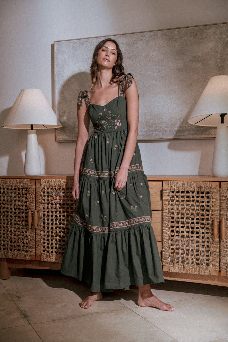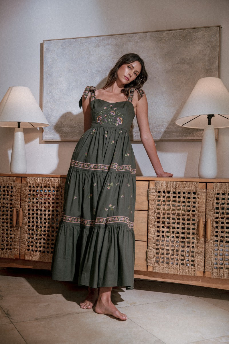 Step into effortless elegance with the Solange Garden Dress, a tiered maxi crafted in deep olive cotton and adorned with intricate floral embroidery. Feminine tie straps and embroidered banding add romantic detailing, while the smocked back ensures an easy, flattering fit. This piece flows beautifully from daytime wanderings to candlelit dinners — pairing vintage charm with modern bohemian grace.