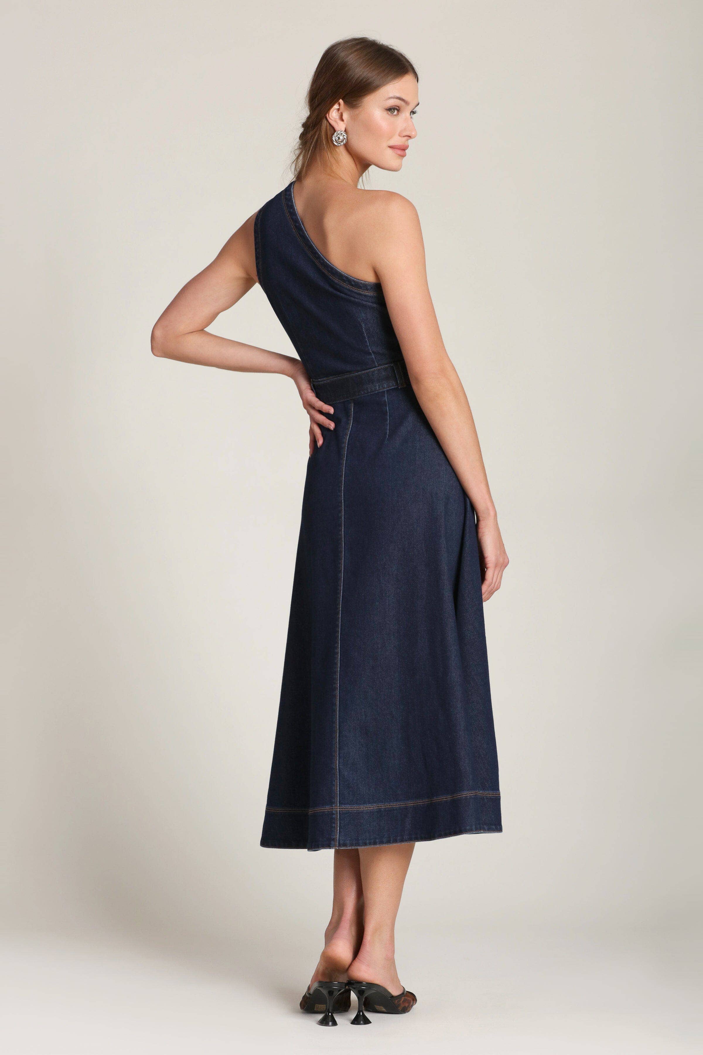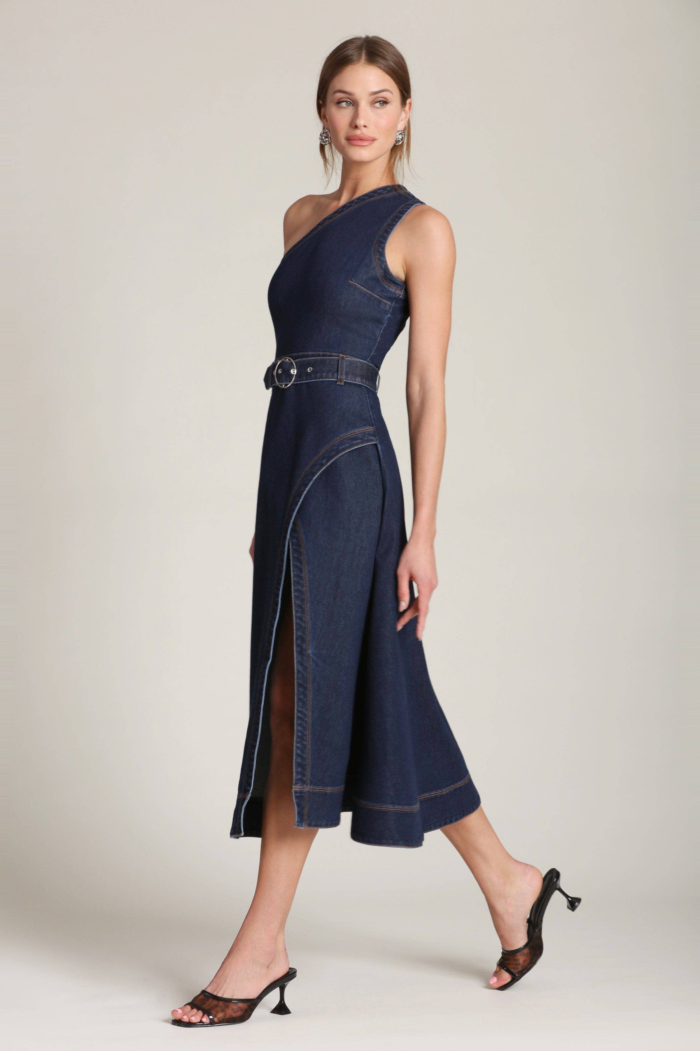 Designed for sun-washed cities and golden-hour plans, this one-shoulder denim midi dress delivers effortless polish with a modern edge. The asymmetrical neckline and clean seaming sculpt the silhouette, while the belted waist and front slit bring movement and ease—perfect for gallery afternoons, coastal dinners, or rooftop cocktails. Style it with heeled sandals and a woven clutch for warm-weather escapes, or add statement earrings and sleek pumps for an elevated evening moment.