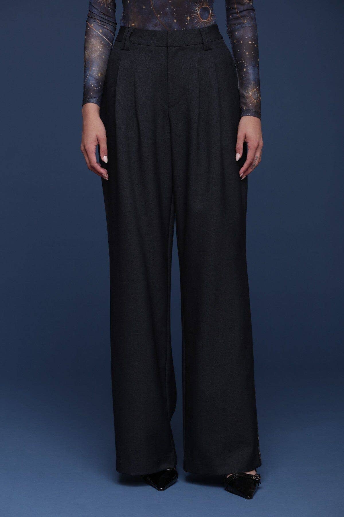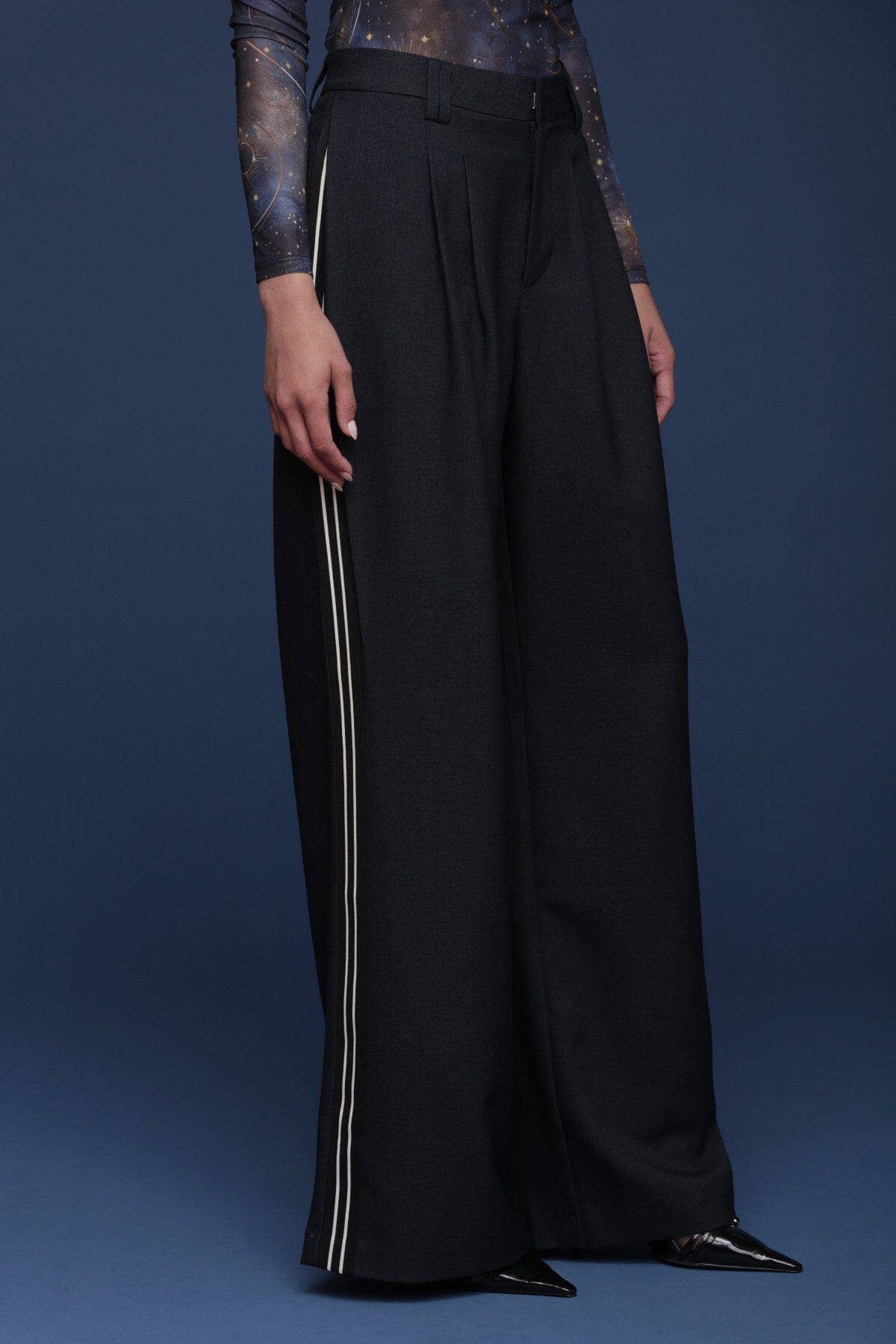 Cue modern tailoring with a statement edge in these wide-leg trousers, cut in soft heather navy suiting fabric and framed with contrast side stripes for a leg-lengthening silhouette. Crisp pleats and clean lines add polish, making them equally striking with a sharp blazer or a delicate evening top.