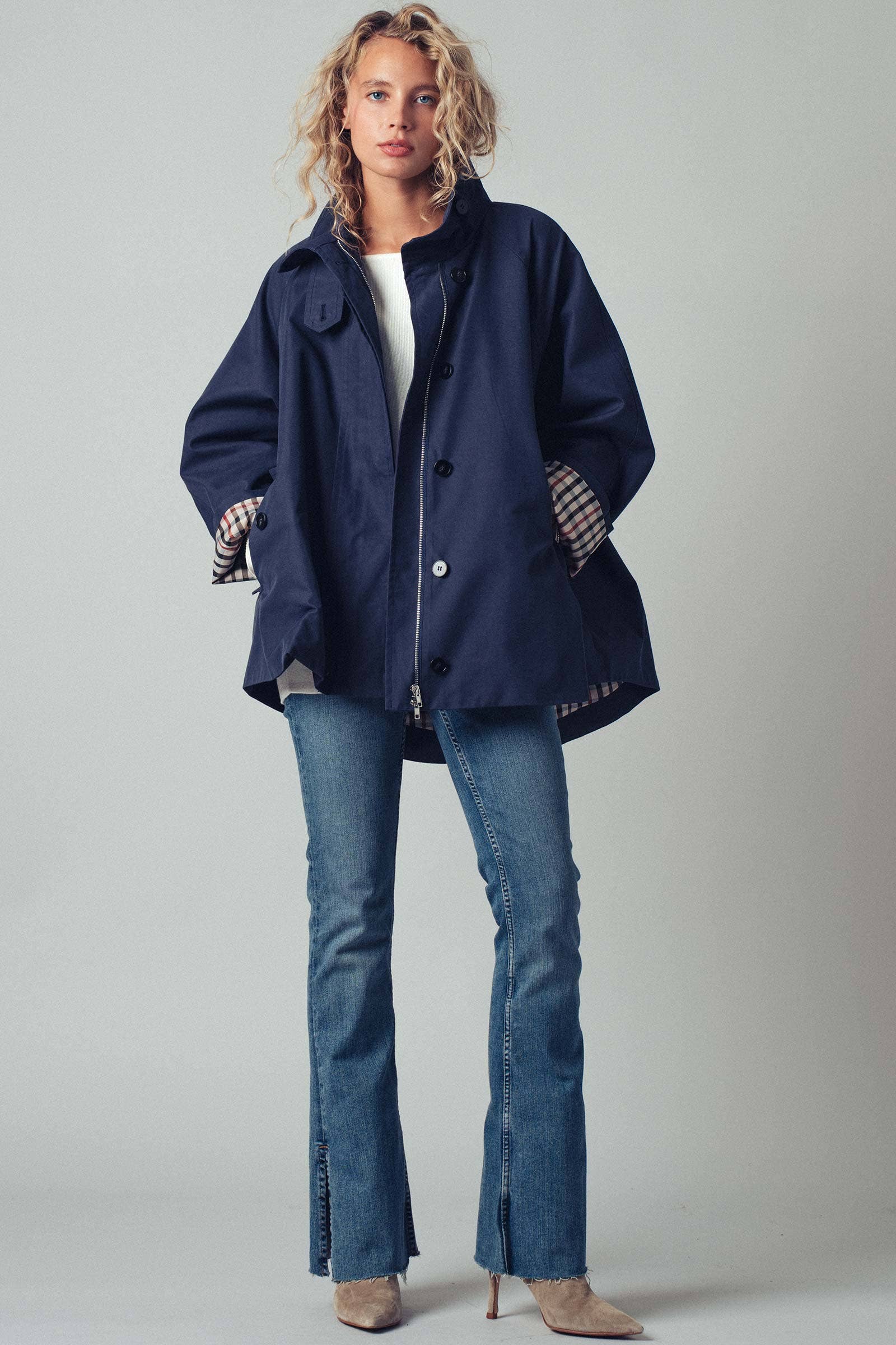 Thoughtful details elevate the piece: a sculptural stand collar, oversized flap pockets, and adjustable side tabs that allow the fit to drape or cinch as you choose. Lightweight yet polished, the Hyde Park Trench is the ultimate transitional layer—equally at home strolling city streets, traveling abroad, or layering over your everyday essentials with understated sophistication.