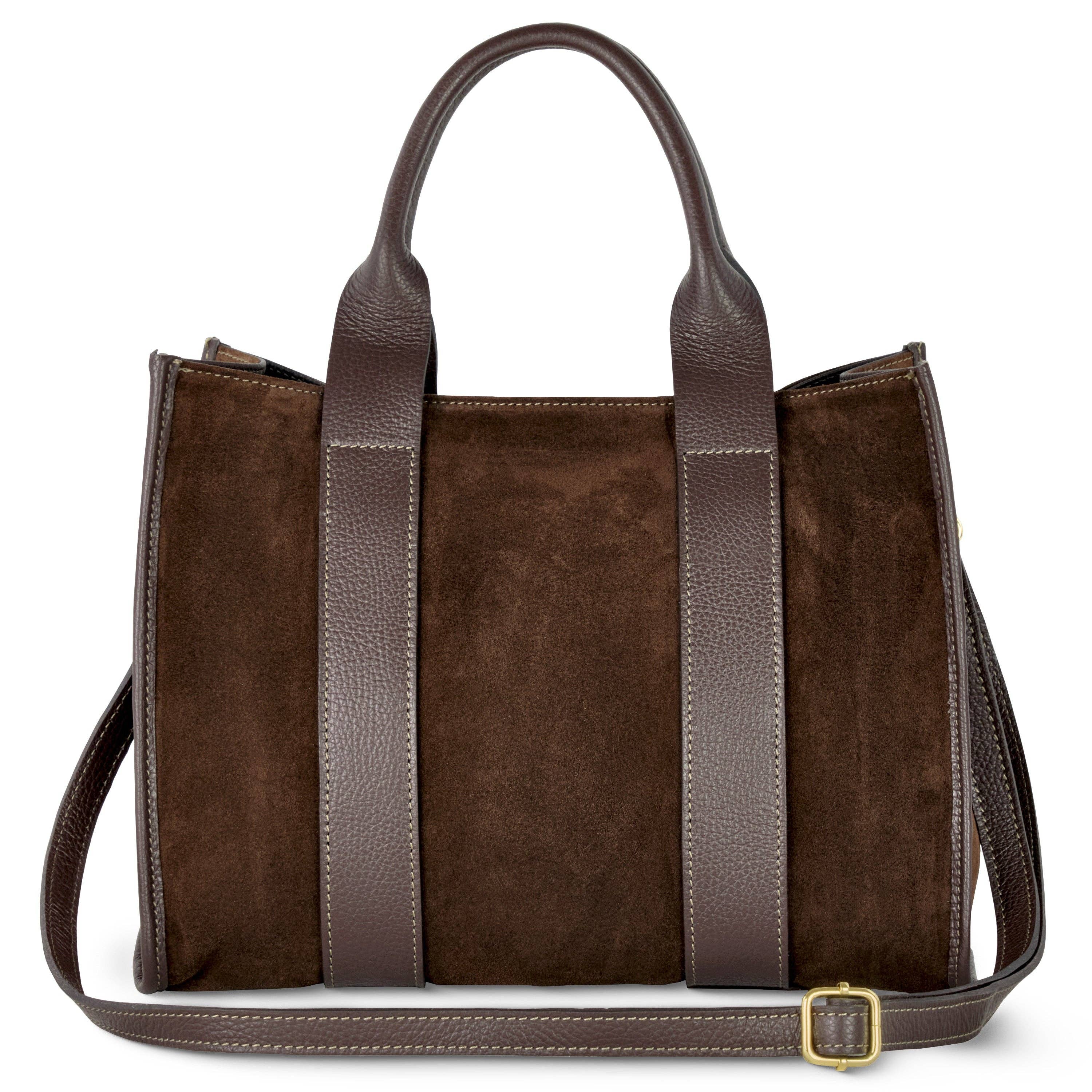 The tote suede bag is an ode to Italian restraint and refined taste. Its architectural form and tactile depth make it a standout in your daily wardrobe. Each element is handmade, echoing the craftsmanship of Florentine artisans. The main body is crafted from natural suede with a velvety surface and even nap. Smooth calf leather inserts run along the vertical lines and handles, adding structure and contrast. This interplay of textures elongates the silhouette and enhances its elegant shape. Inside is a spacious compartment lined with durable polyester twill. It holds all your daily essentials with ease — wallet, makeup pouch, phone, and even a compact tablet — while remaining lightweight on the shoulder. The short leather handles are embedded into wide leather panels that stretch from bottom to top, doubling as both structural and decorative elements. The detachable adjustable strap adds versatility for shoulder or crossbody wear. This model is made for a woman who values subtlety and function.