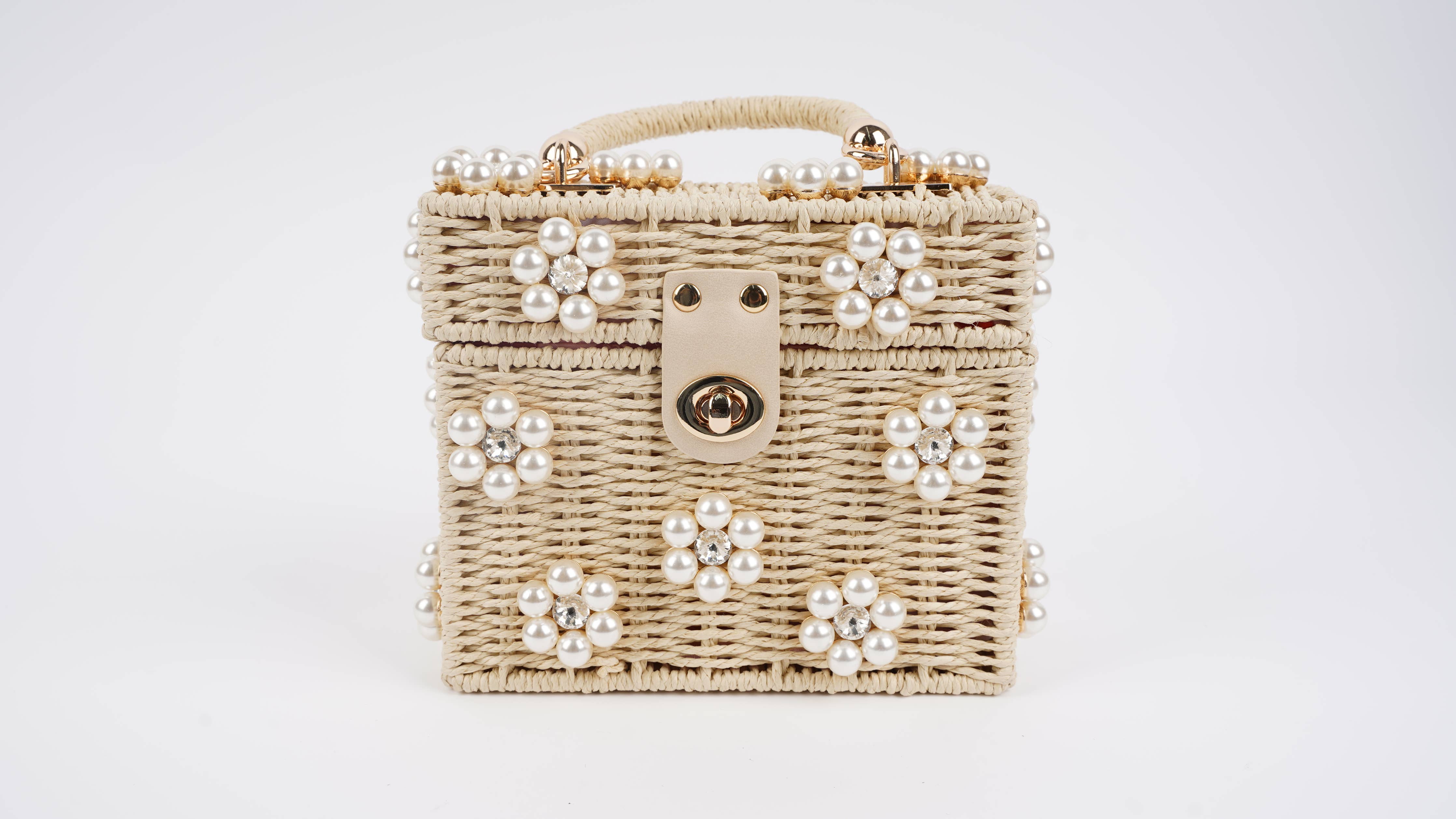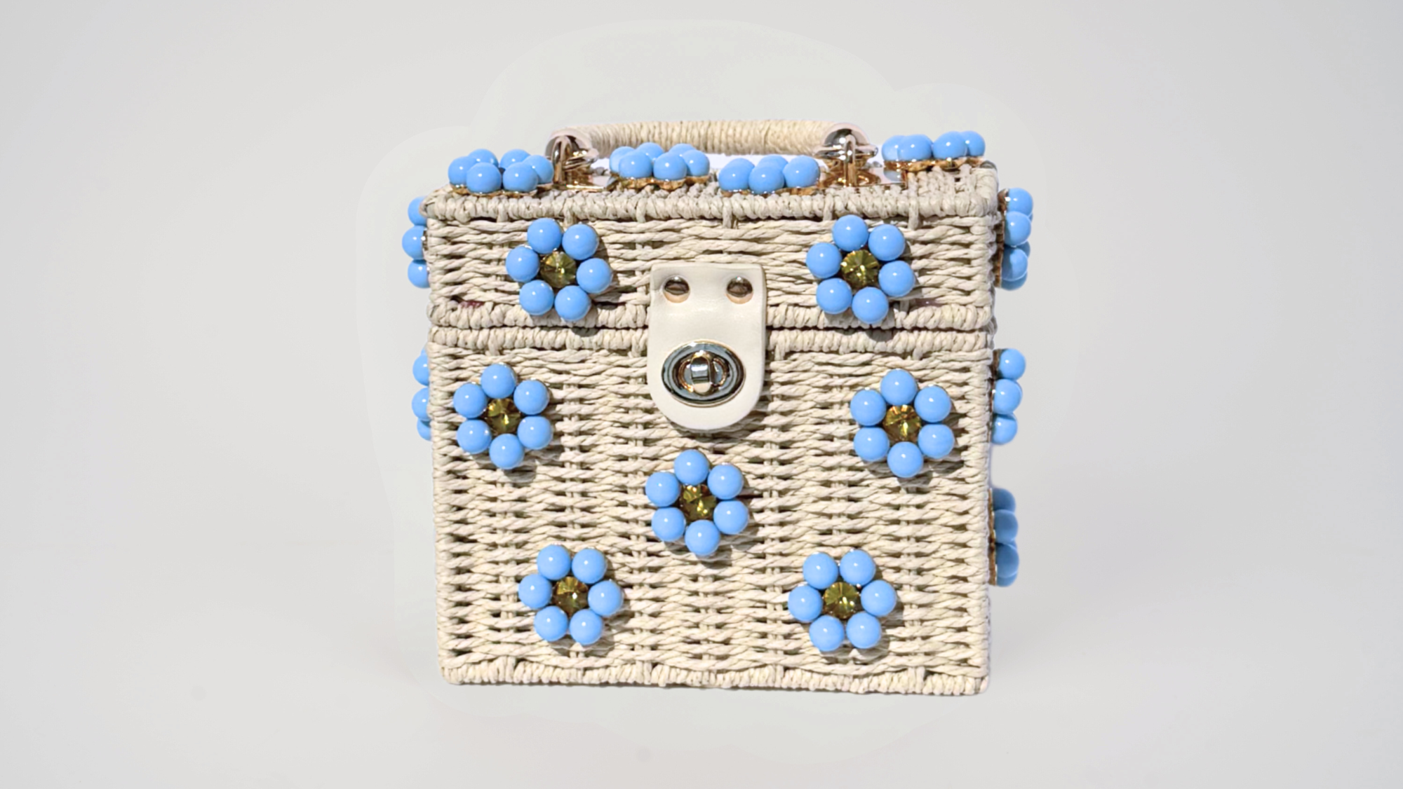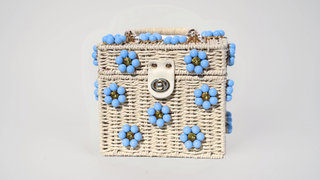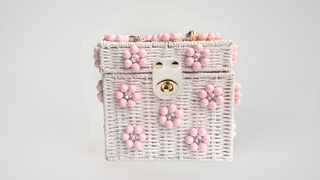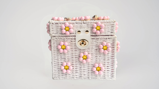 Inspired by lazy beach afternoons and blooming dunes, the Salt + Petal Mini Tote is a radiant mix of whimsy and coastal cool. Textured white wicker is brought to life with soft blush daisy appliqués and sunshine-yellow centers. A gleaming clasp adds a polished finish to this playful piece — your go-to for breezy escapes and seaside style.