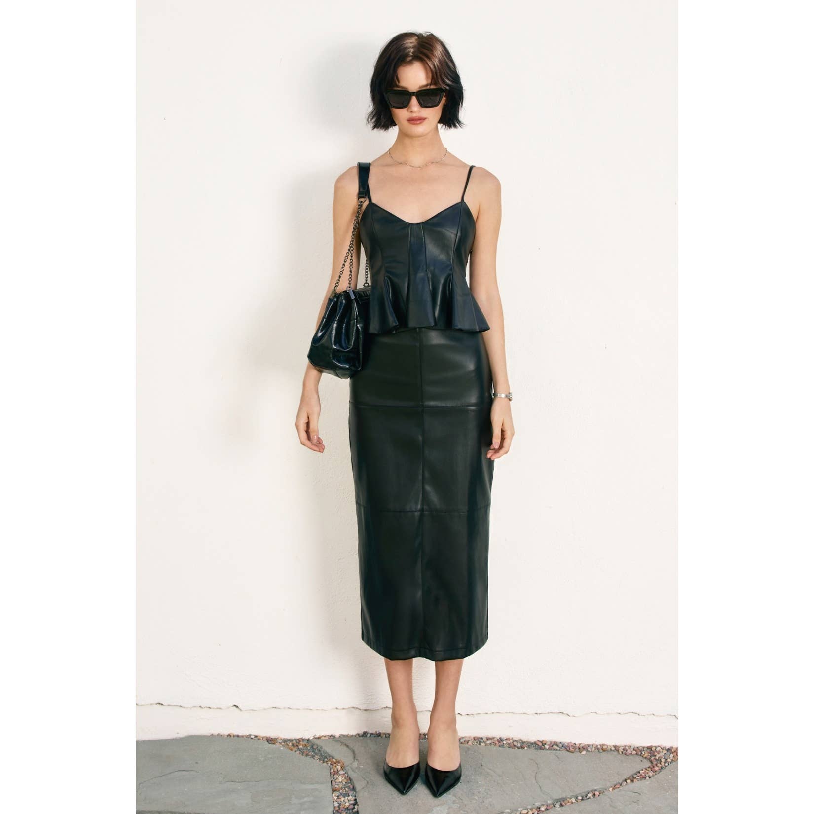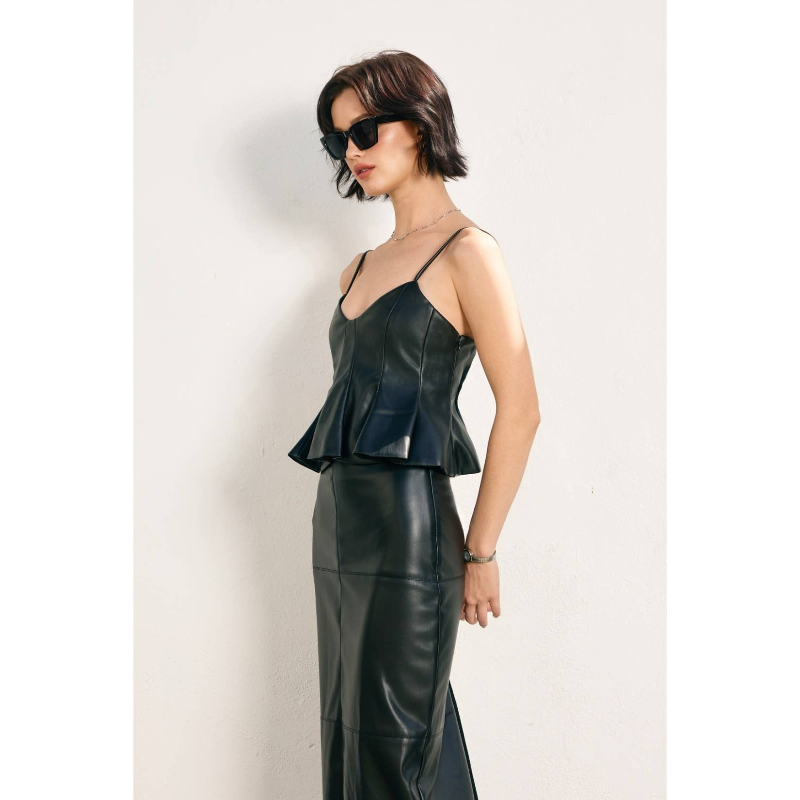 Sleek with a sculptural edge, the Noir Riviera Peplum Top brings modern polish to faux leather. Designed with a softly structured bodice, delicate straps, and a subtle peplum flare, it creates a flattering, feminine silhouette with just the right amount of drama. Pair it with tailored trousers or the matching midi for an effortlessly elevated look that transitions from sunset cocktails to city evenings. Create the perfect concert look with your favorite jeans.