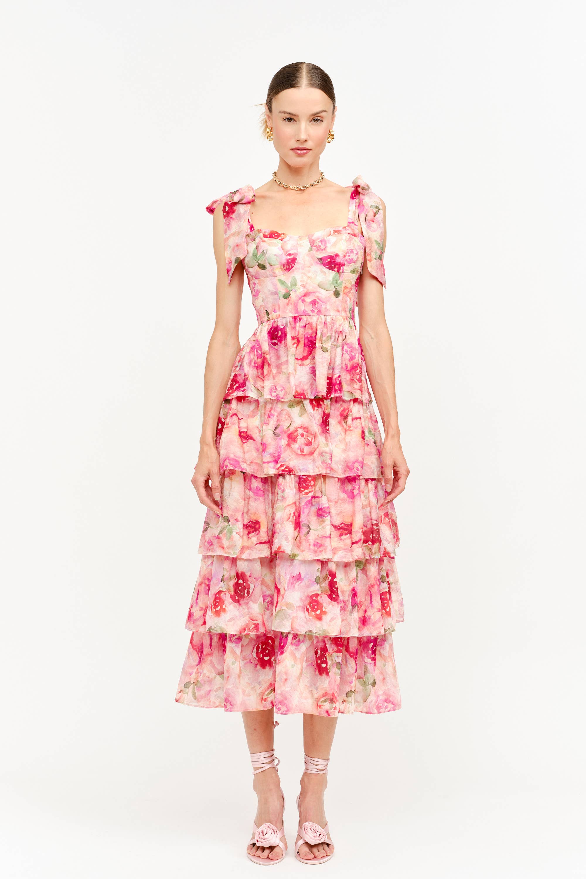 Designed in a painterly rose print of blush, fuchsia, and soft green, this piece feels like stepping into a garden at golden hour. The sweetheart neckline with self-tie shoulder bows adds a playful, feminine touch, while cascading tiers create graceful movement with every step.