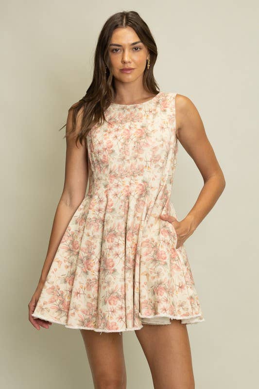 Romantic florals meet tailored structure in the Garden Atelier Mini Dress. Crafted from 100% cotton with a substantial, denim-like feel, this piece holds its shape beautifully while remaining breathable and comfortable. The sleeveless, fitted bodice and soft pleated skirt create a flattering, feminine silhouette that moves with ease. Finished with subtle texture and a refined mini length, it’s perfect for day-to-night styling with boots, flats, or heels.