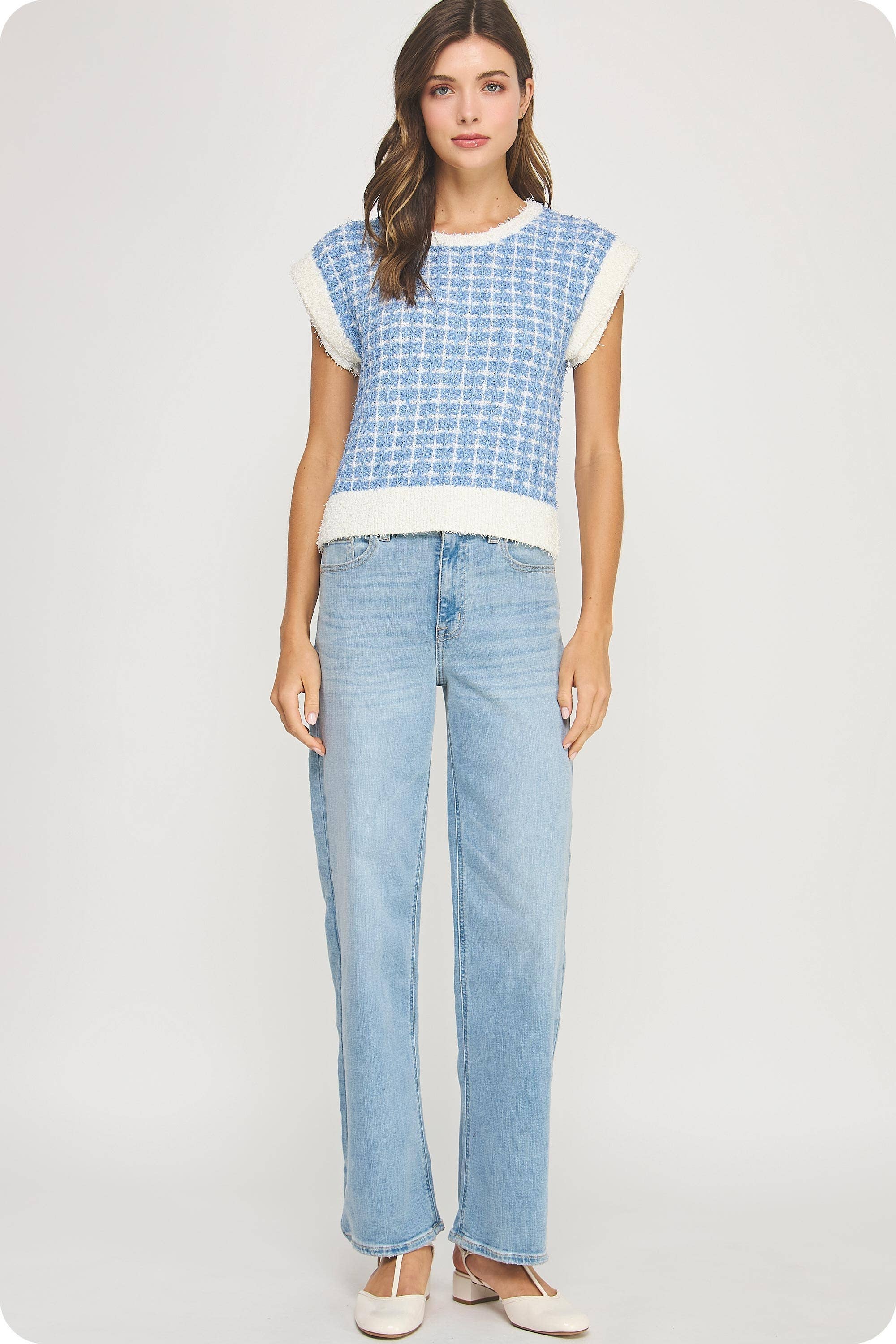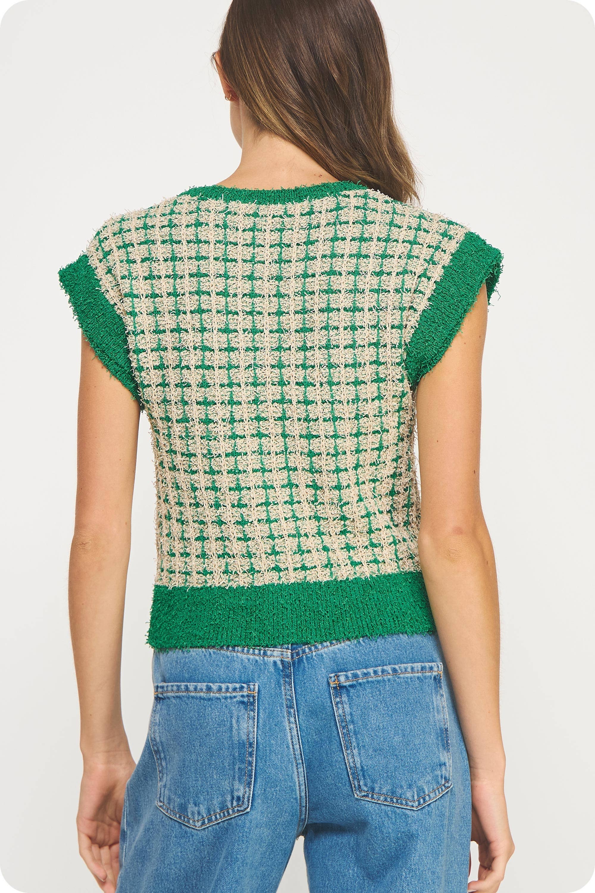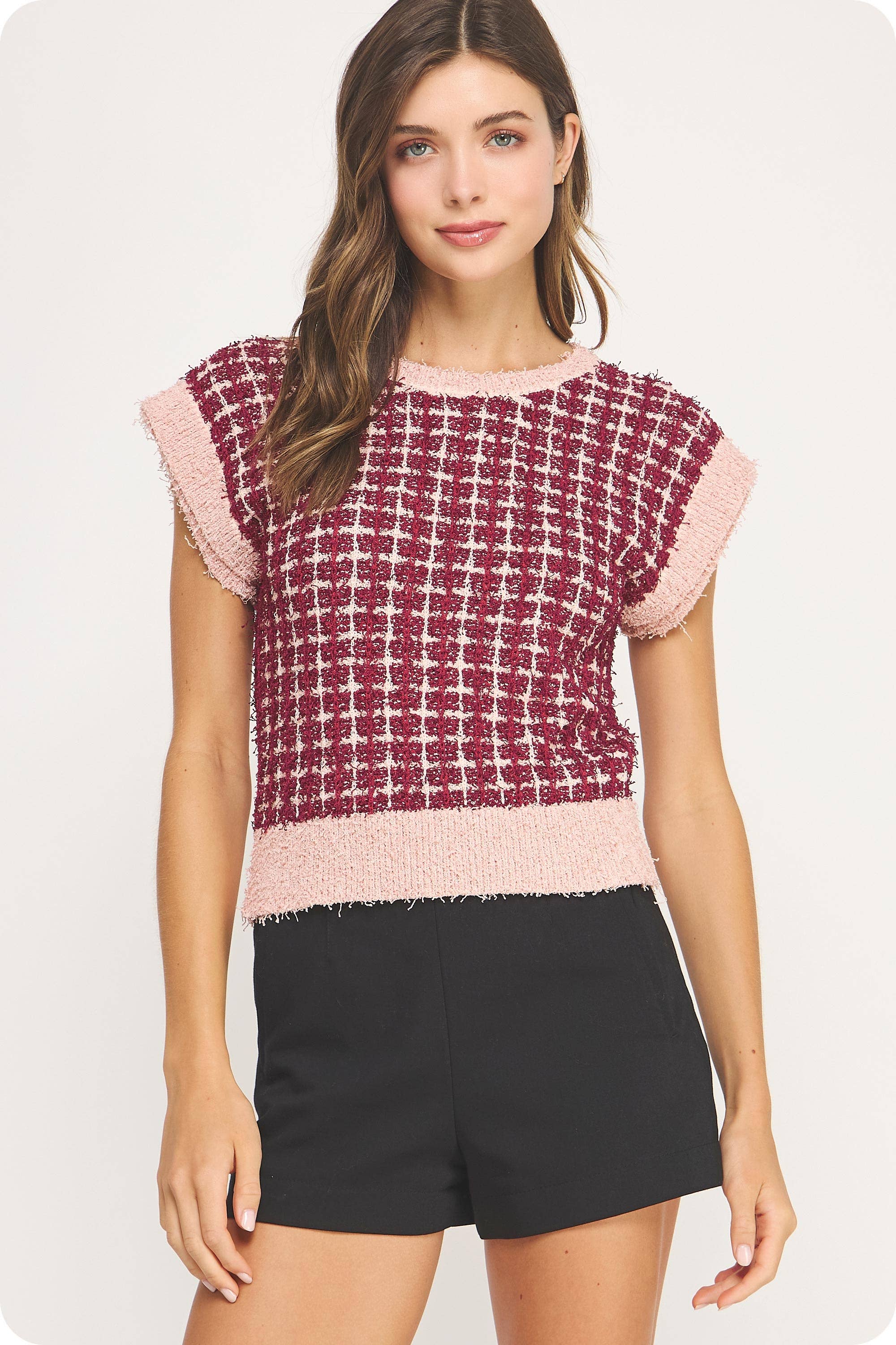 Sleeveless check sweater top in fray knit fabric. This top is knitted in a frayed tweed check pattern and it features ribbed round neck, short cap sleeve with ribbed cuff, and ribbed hem.