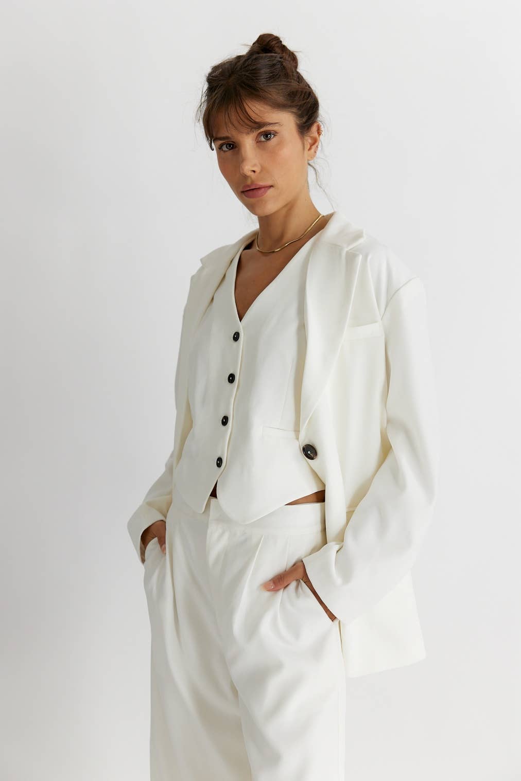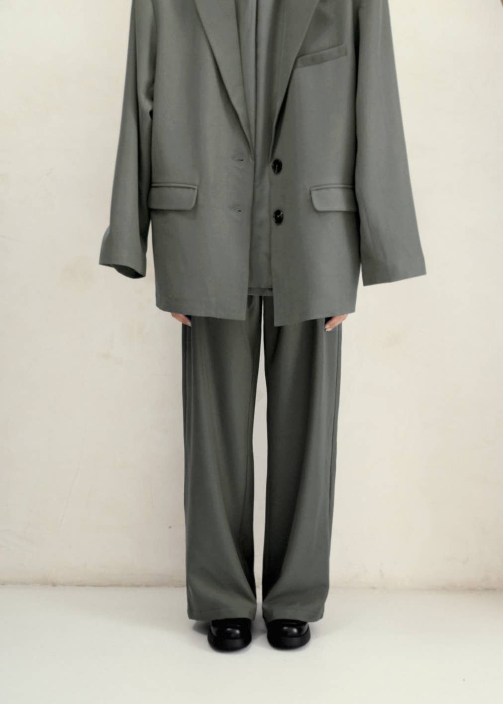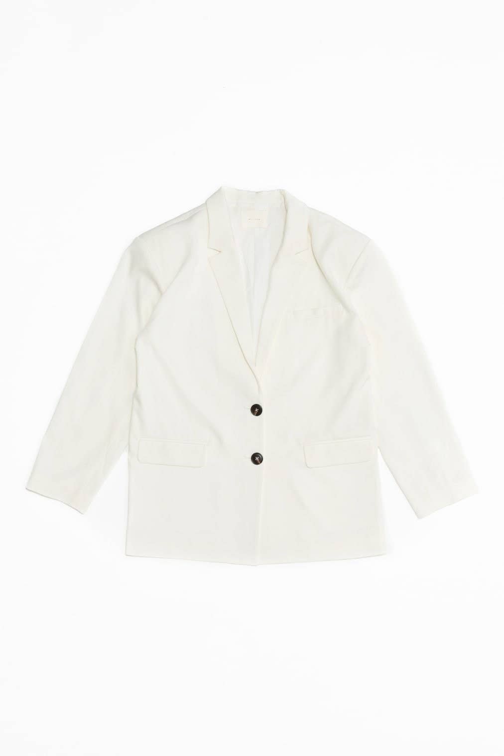 Taking inspiration from vintage silhouettes, The Leola Jacket is a transitional, oversized single breasted blazer that exemplifies smart styling. Features a single welt chest pocket, notched lapel, side flap pockets. shoulder padding and a back vent. This statement piece will complement any outfit. Piece together with The Leola Vest and The Leola Trousers for a full, uniform suit set.