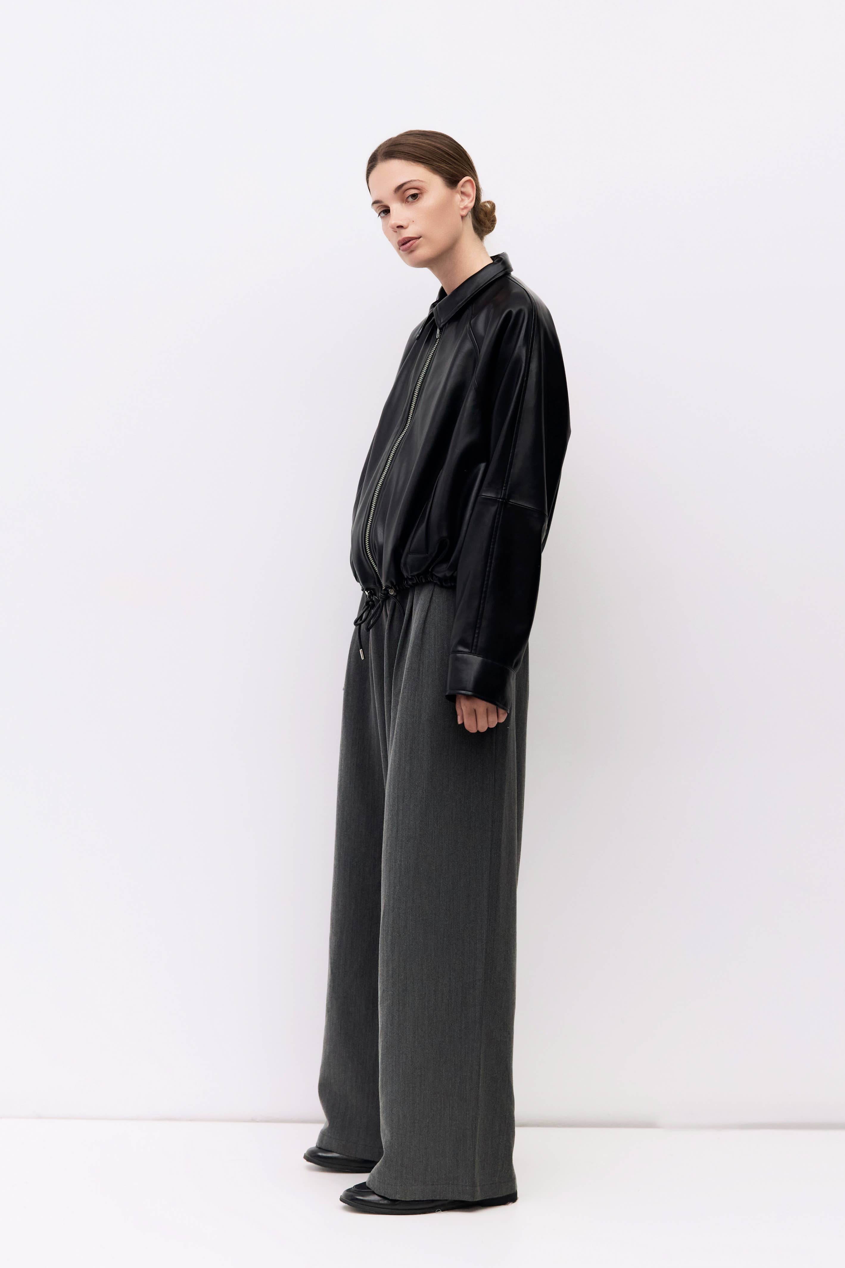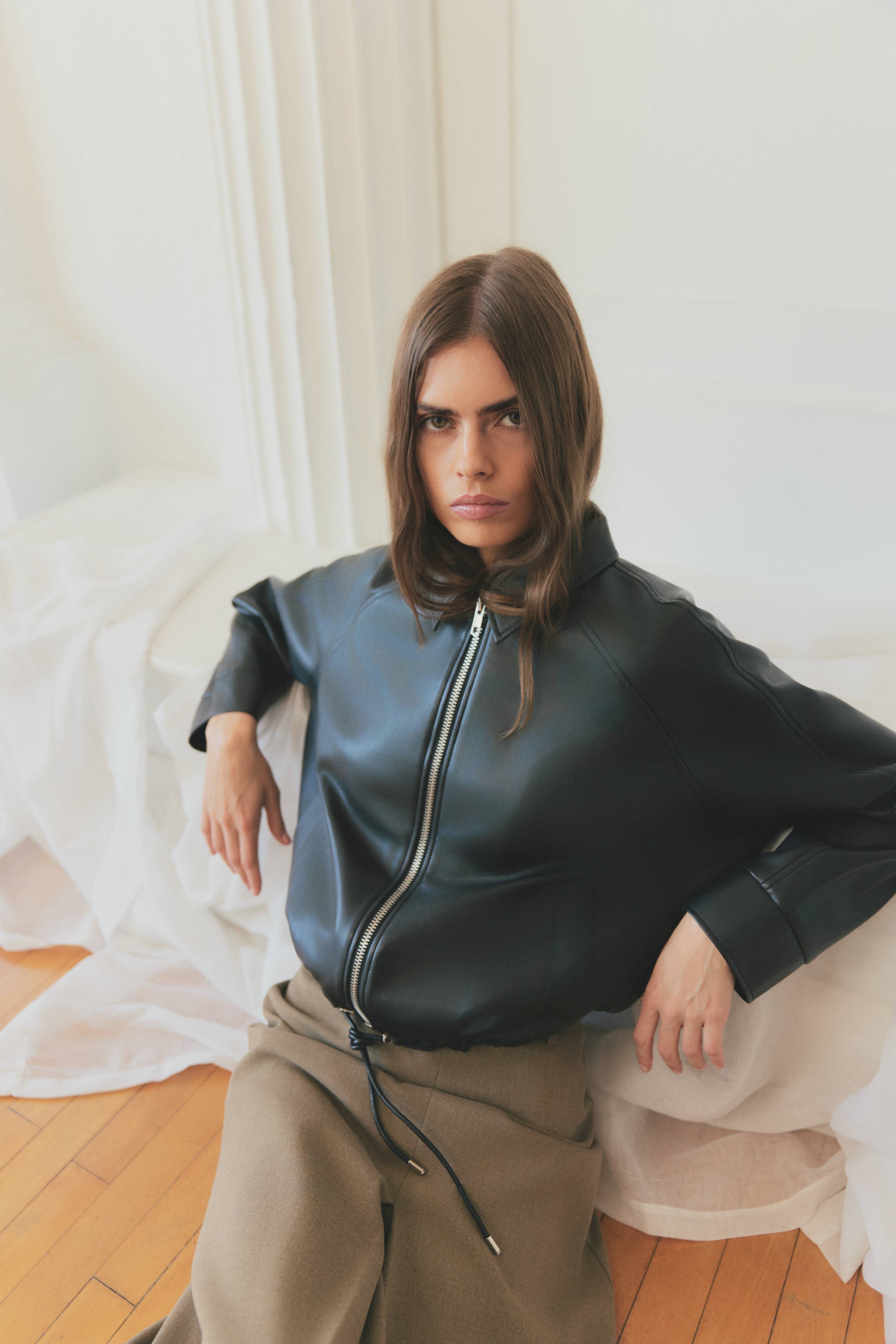 The Lizette Jacket is a semi-cropped bomber crafted from soft pleather with a structured drape. Designed with a collared neckline, front zip closure, and a drawstring hem to adjust the shape. Finished with long sleeves for a clean, utilitarian silhouette.