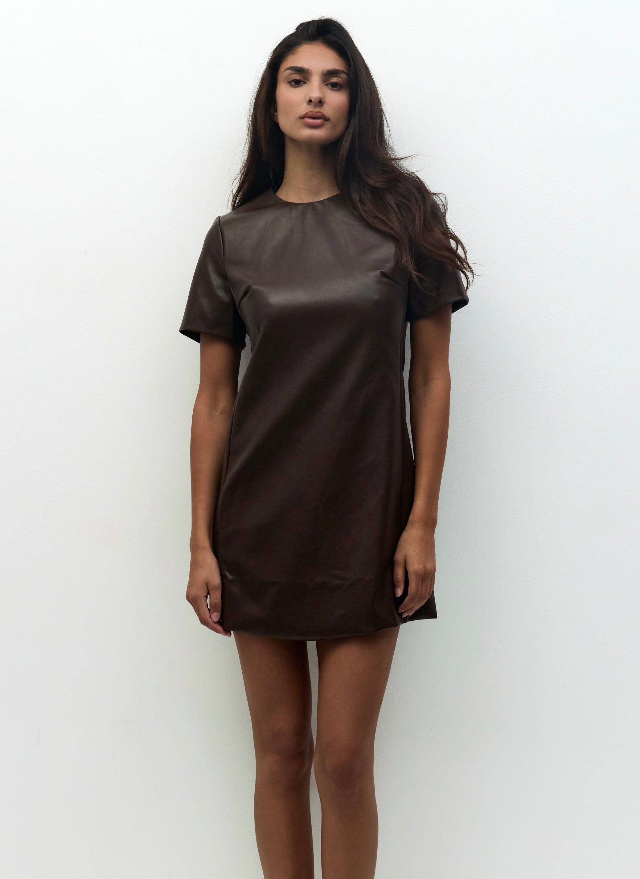 The Rebekah Dress is a fitted mini crafted from smooth faux leather and fully lined for comfort. Featuring a crew neckline, short sleeves, and a partial zipper closure at the center back, it delivers a sleek, modern silhouette.
