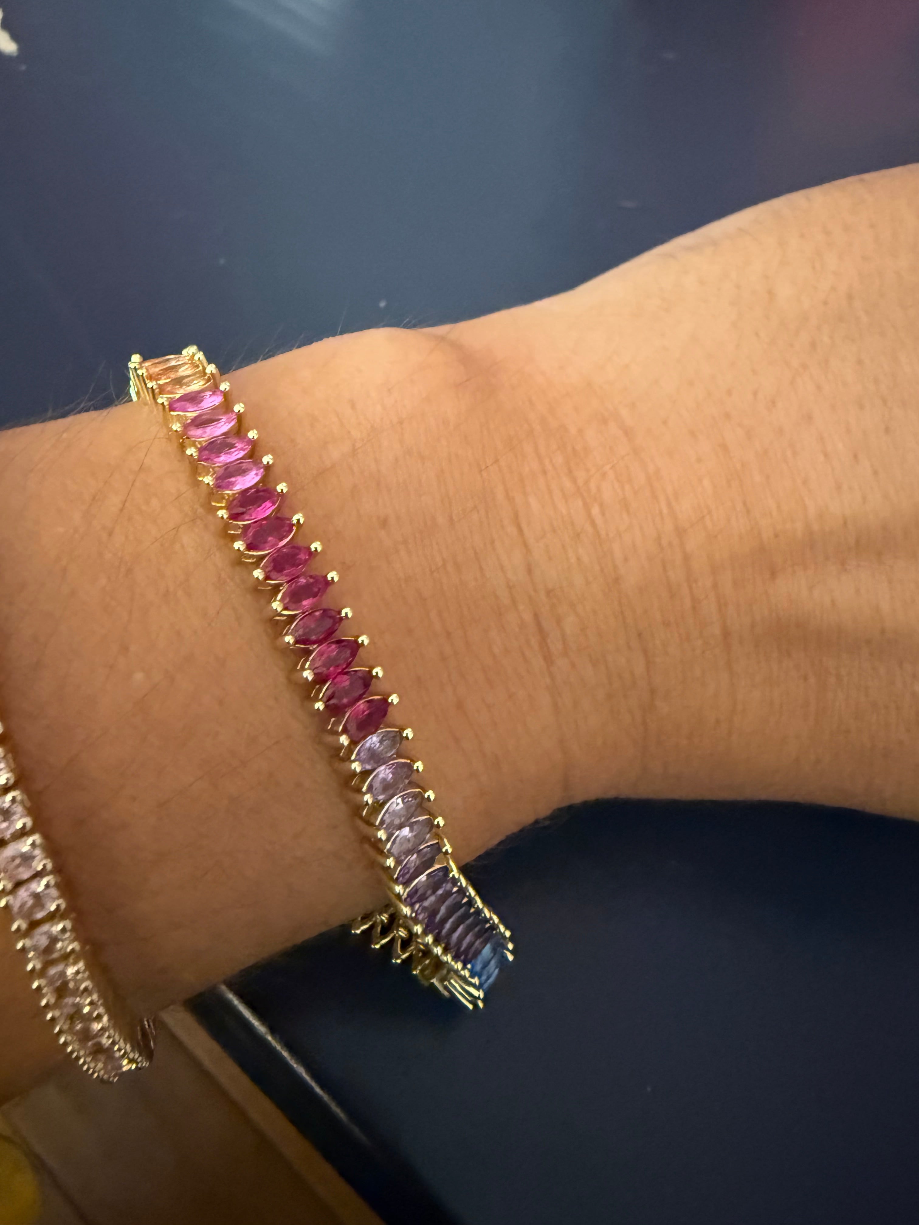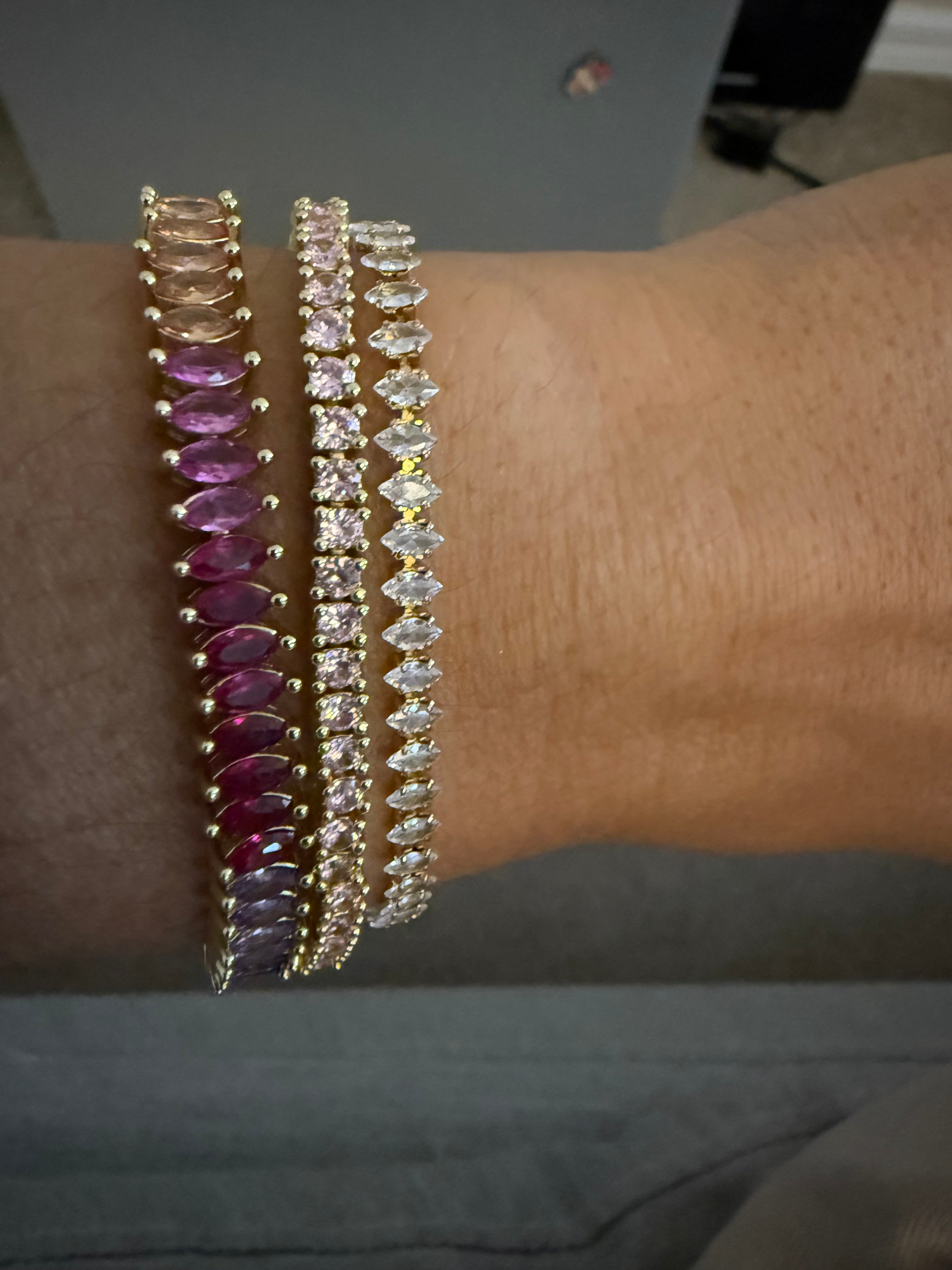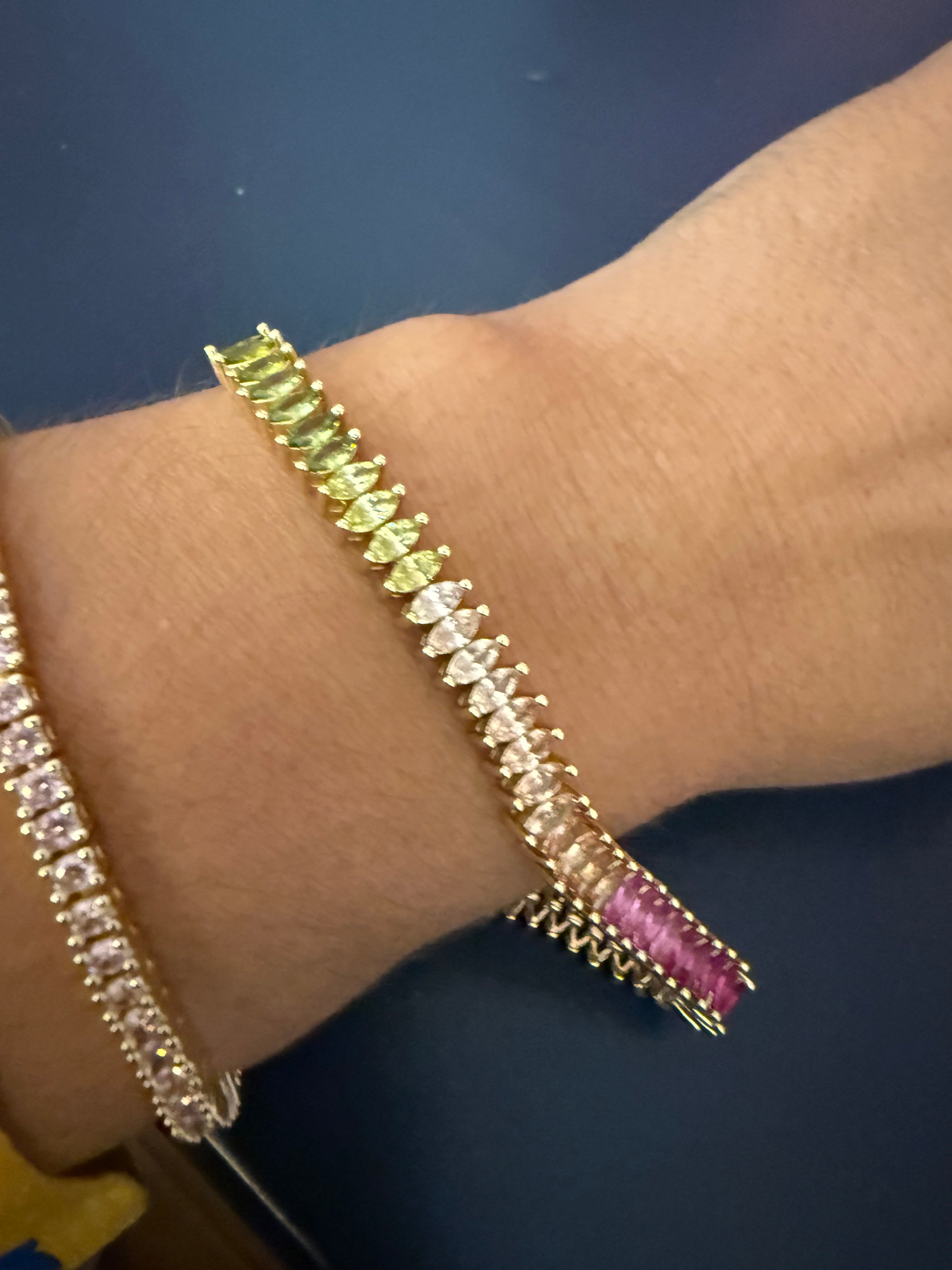 Treat yourself or a loved one to the stunning Maisley Tennis Bracelet. Adorned with sparkling diamond shape cz stones, it adds a touch of luxury to any look. A perfect accessory to bring out your inner glam!