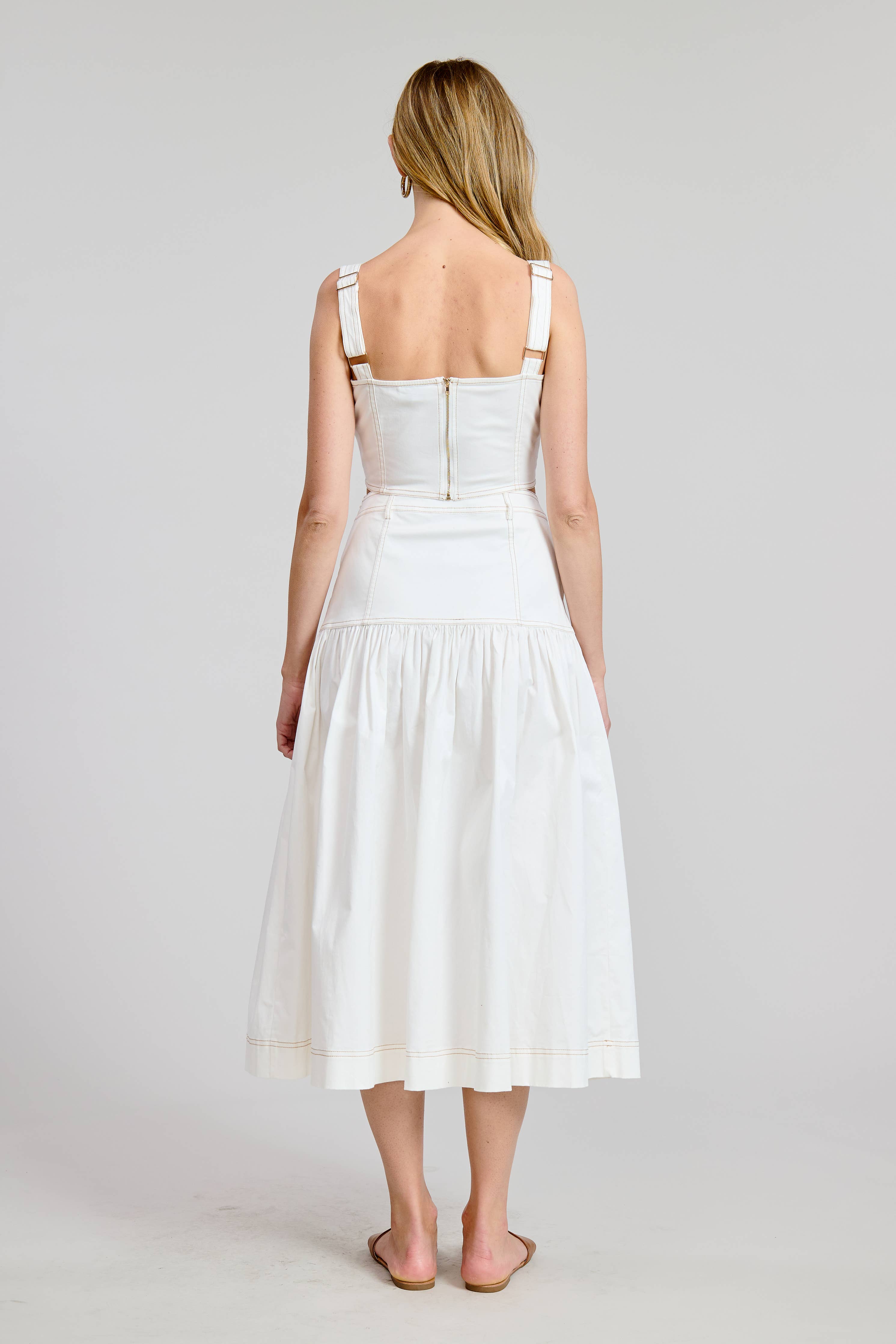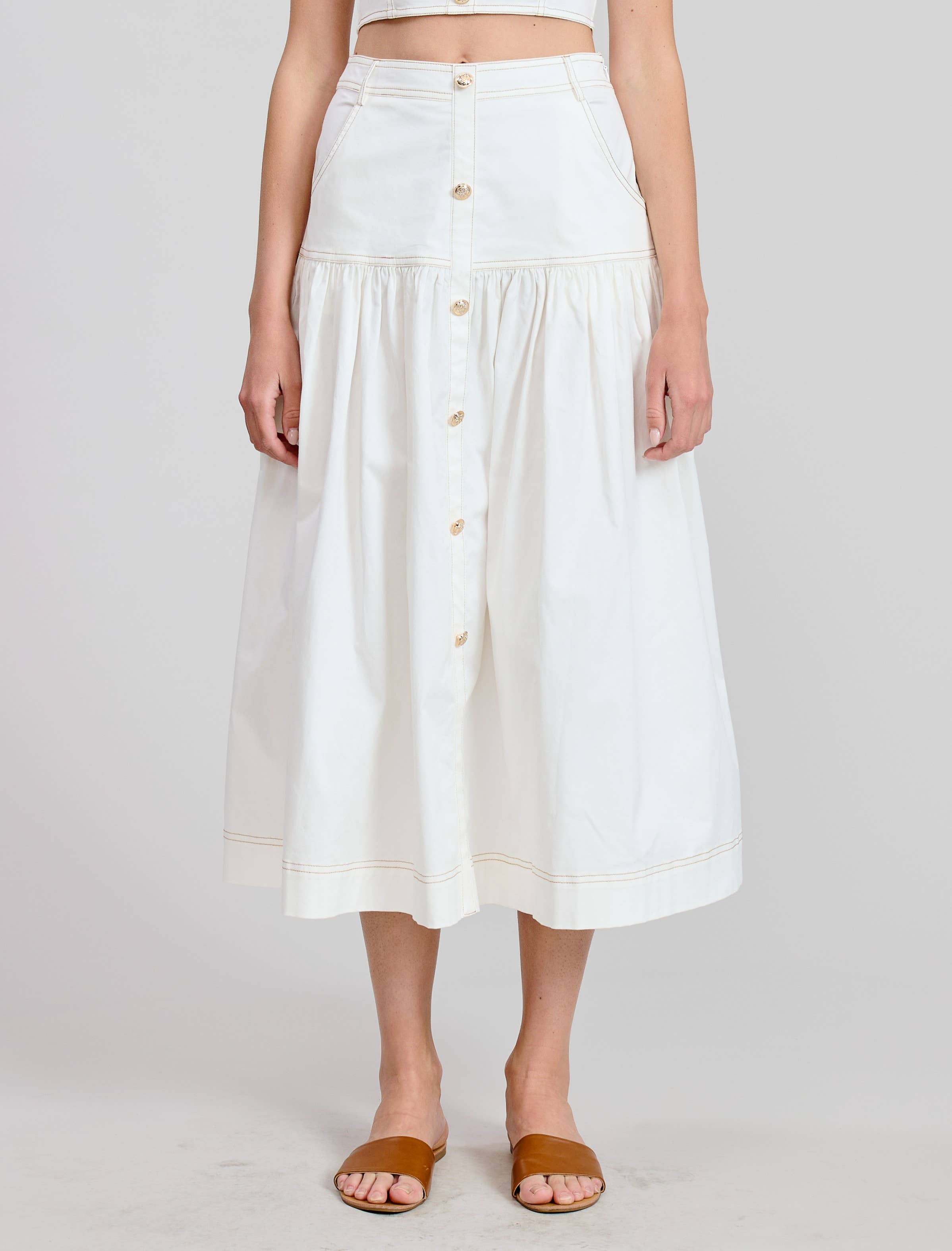 Airy, timeless, and designed to move with ease, the Côte Blanche Midi Skirt brings understated luxury to any summer wardrobe. The high-waisted shape lengthens the silhouette, while the button-front detailing and softly gathered skirt add just the right amount of volume. Its clean white finish makes it endlessly versatile — relaxed with flat slides or elevated with a strappy heel.