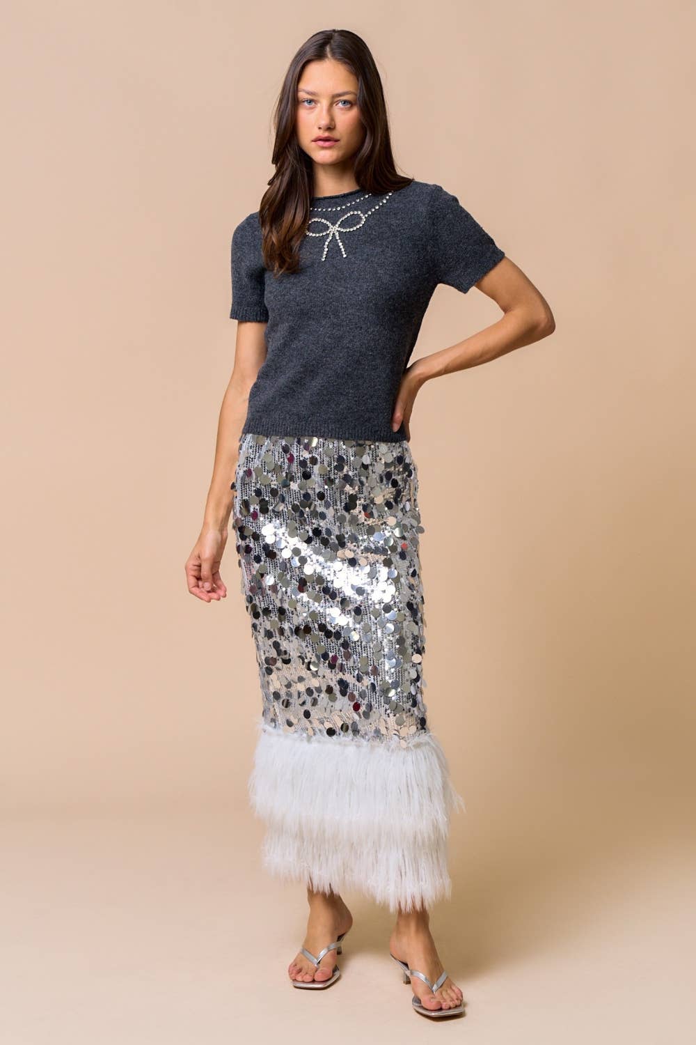 Soft and charming, this sweater top features a delicate bow detail that adds a sweet, boutique-ready touch to cozy knitwear. Perfect for layering or wearing on its own for a polished, casual look. Pair with jeans or skirts for effortless everyday style.