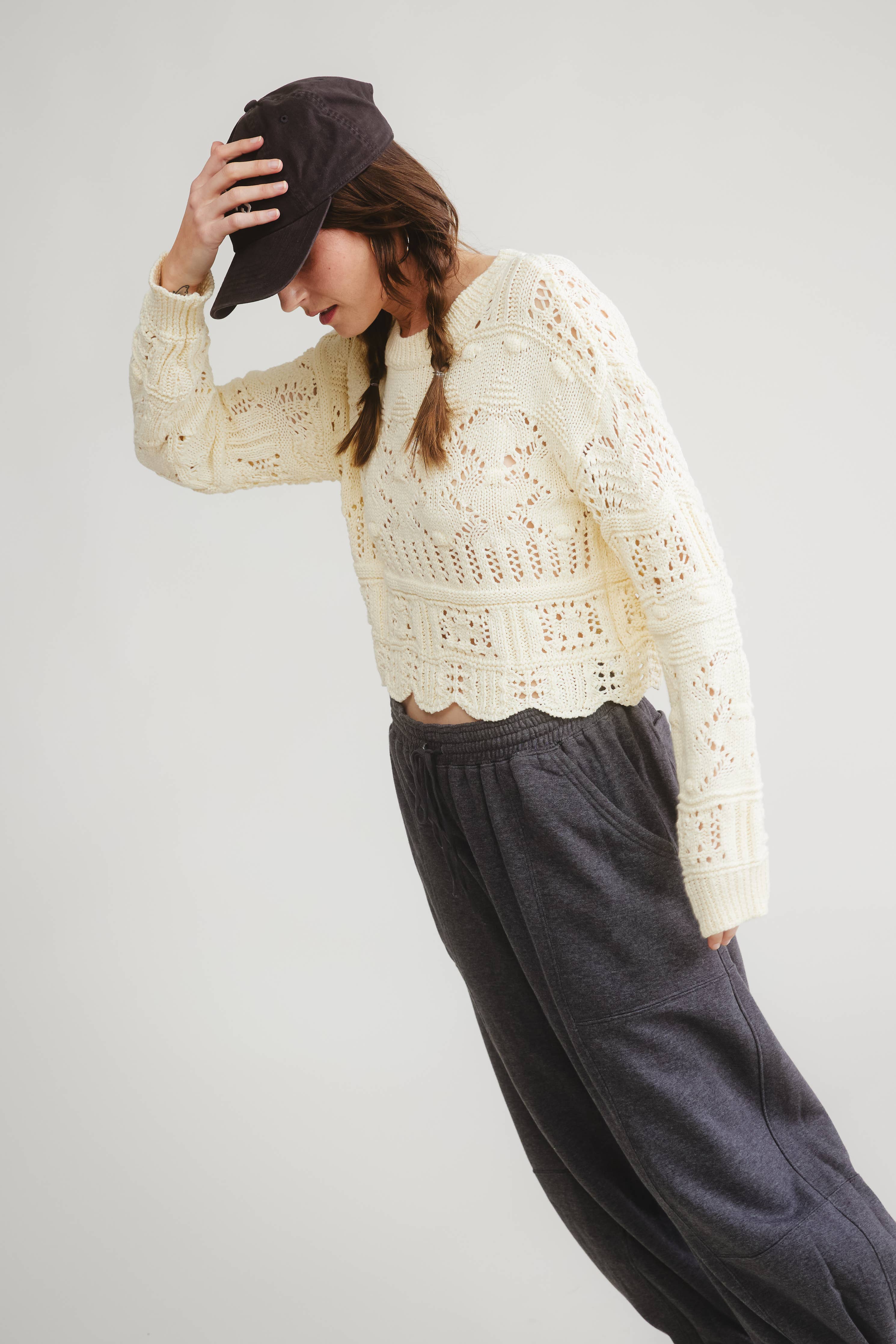 The Marion Sweater brings effortless romance to everyday comfort. Crafted in a soft, airy crocheted cotton knit, it features intricate open-work detailing and subtle textural stitching that create a beautifully feminine pattern from shoulder to hem. A gently scalloped edge adds a delicate, handcrafted finish, while the relaxed, slightly cropped silhouette keeps the look modern and easy to style.