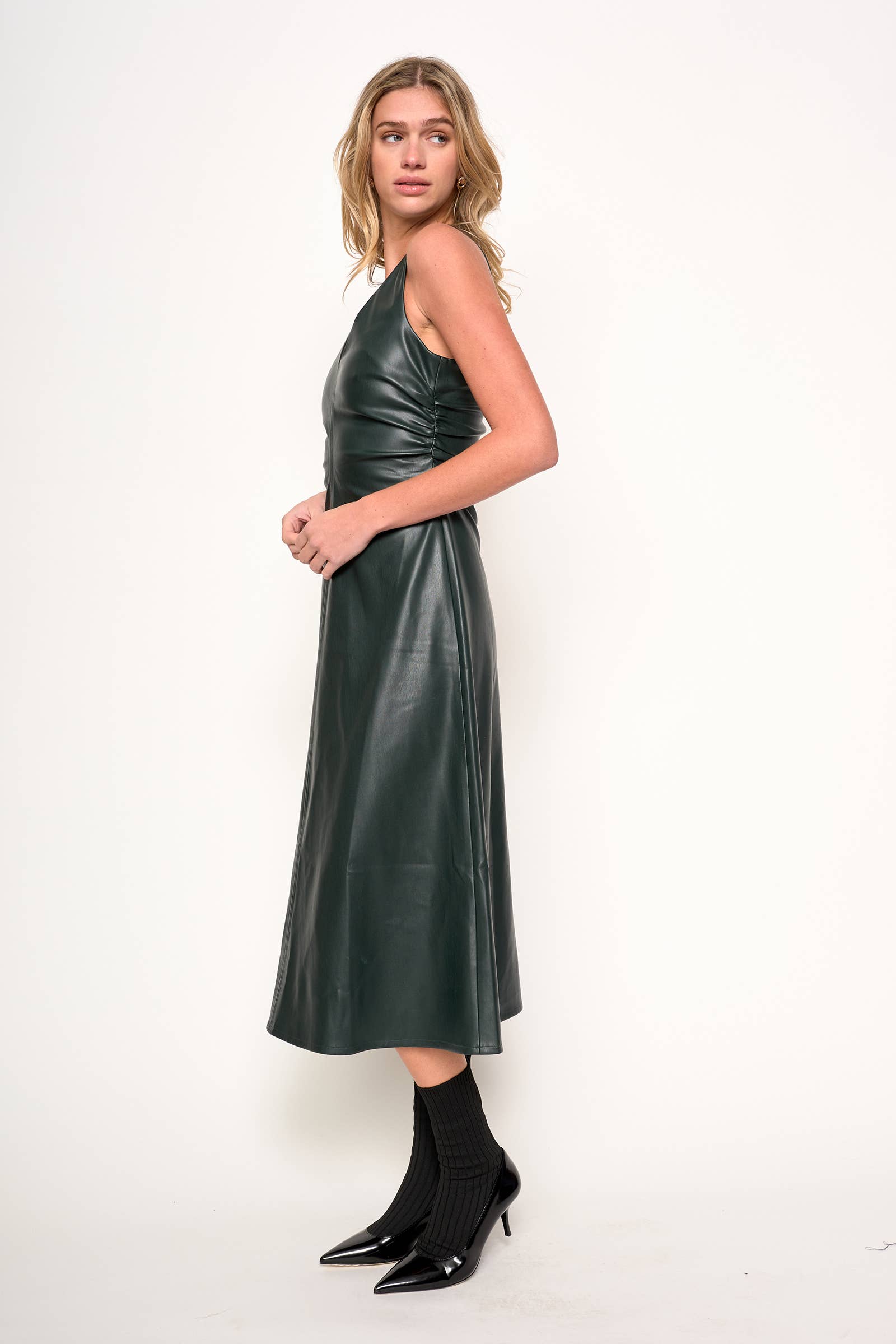 Command the room in The Ivy Luxe Dress — a sculpted faux leather midi that blends polish with a hint of rebellion. In a rich forest green with subtle ruching and a clean V-neckline, this sleeveless silhouette contours the body and flares effortlessly at the hem. Equal parts modern and timeless, it’s your go-to for gallery nights, rooftop cocktails, or wherever power dressing meets cool-girl energy.