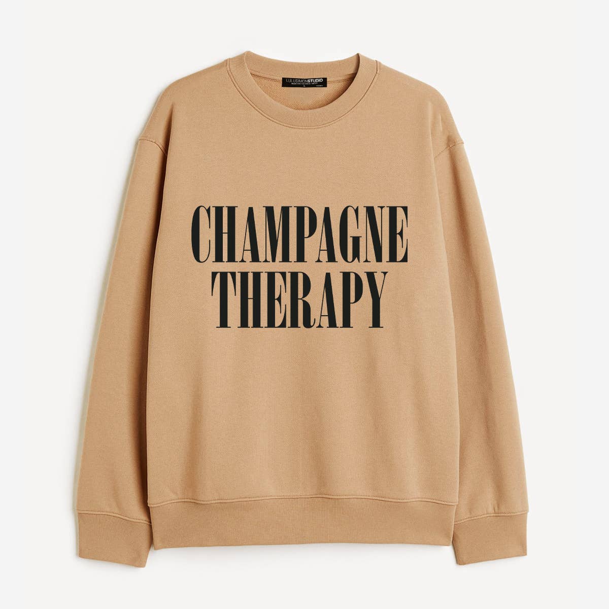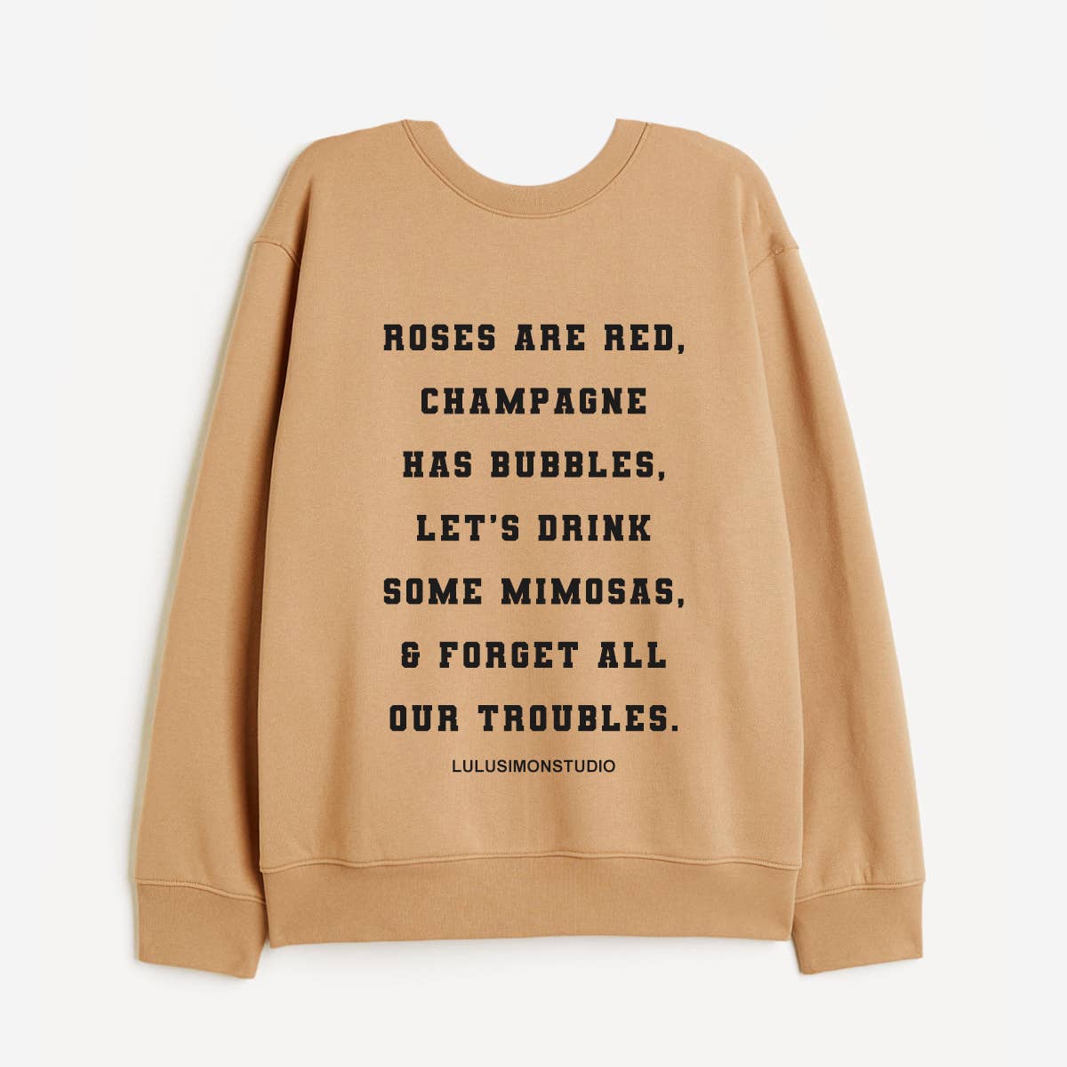 "Champagne Therapy" on front in black ink -"Roses are red..." on back in black ink -Sand color pullover -Super cozy, slouchy, comfy + plush -