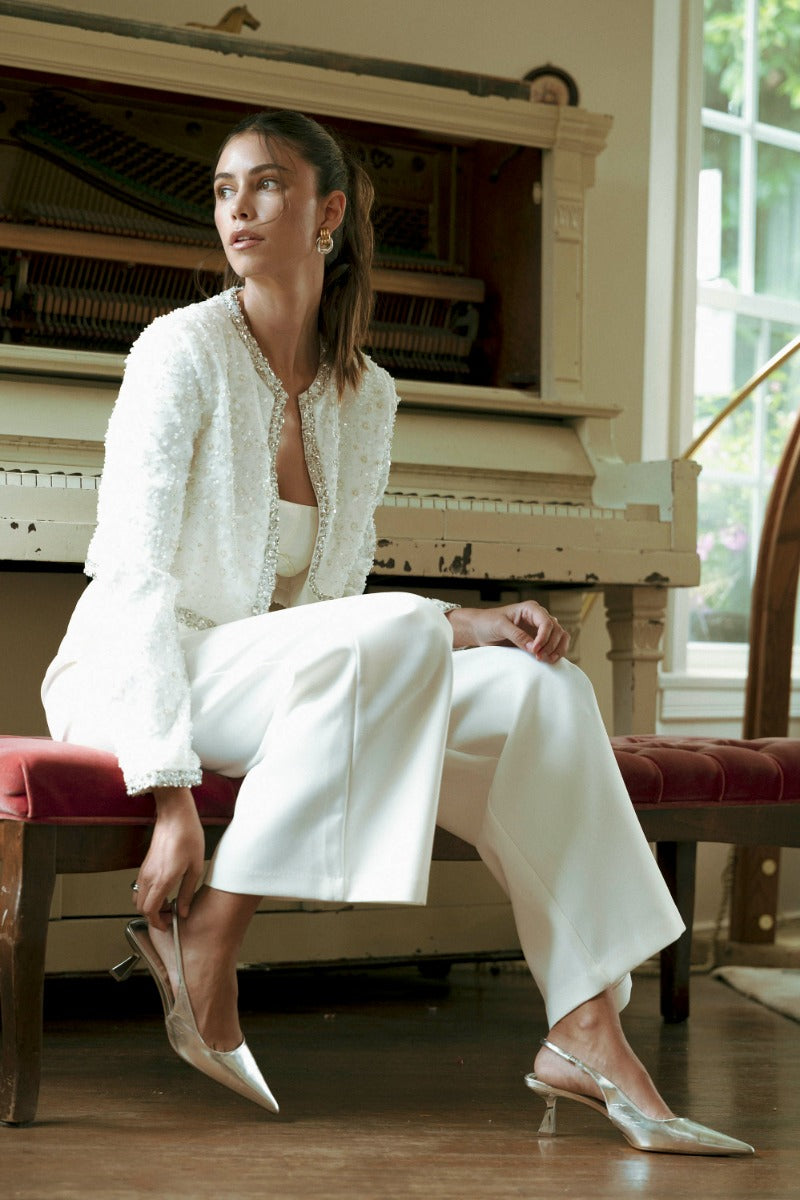 A true showpiece of elegance, the Palais Pearl Jacket is crafted with intricate pearl beading, shimmering sequins, and hand-set crystal trim that frames the silhouette with a soft, luminous glow. Its cropped, structured cut adds a modern touch, while the richly textured detailing gives it an heirloom feel.