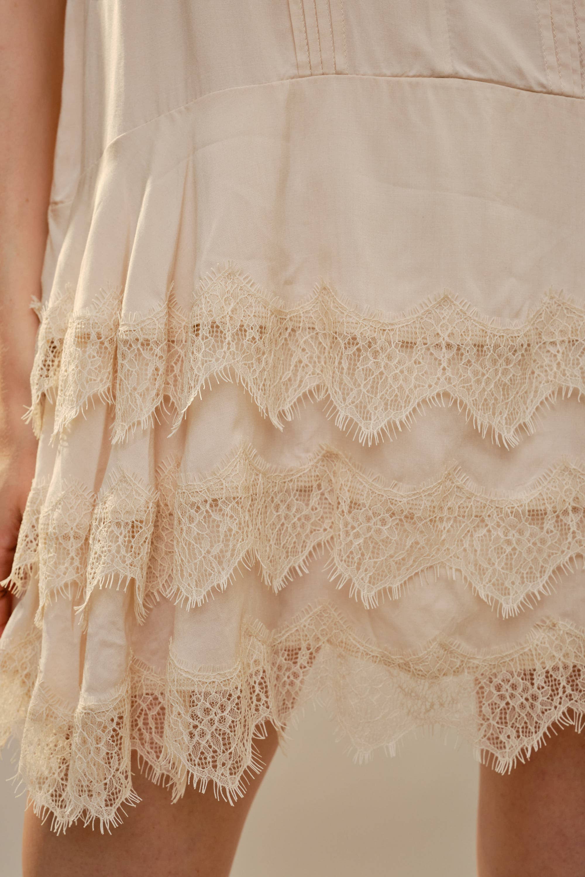 Adjustable strap mini dress with lace-trimmed neckline and tiered scallop lace along the hem.