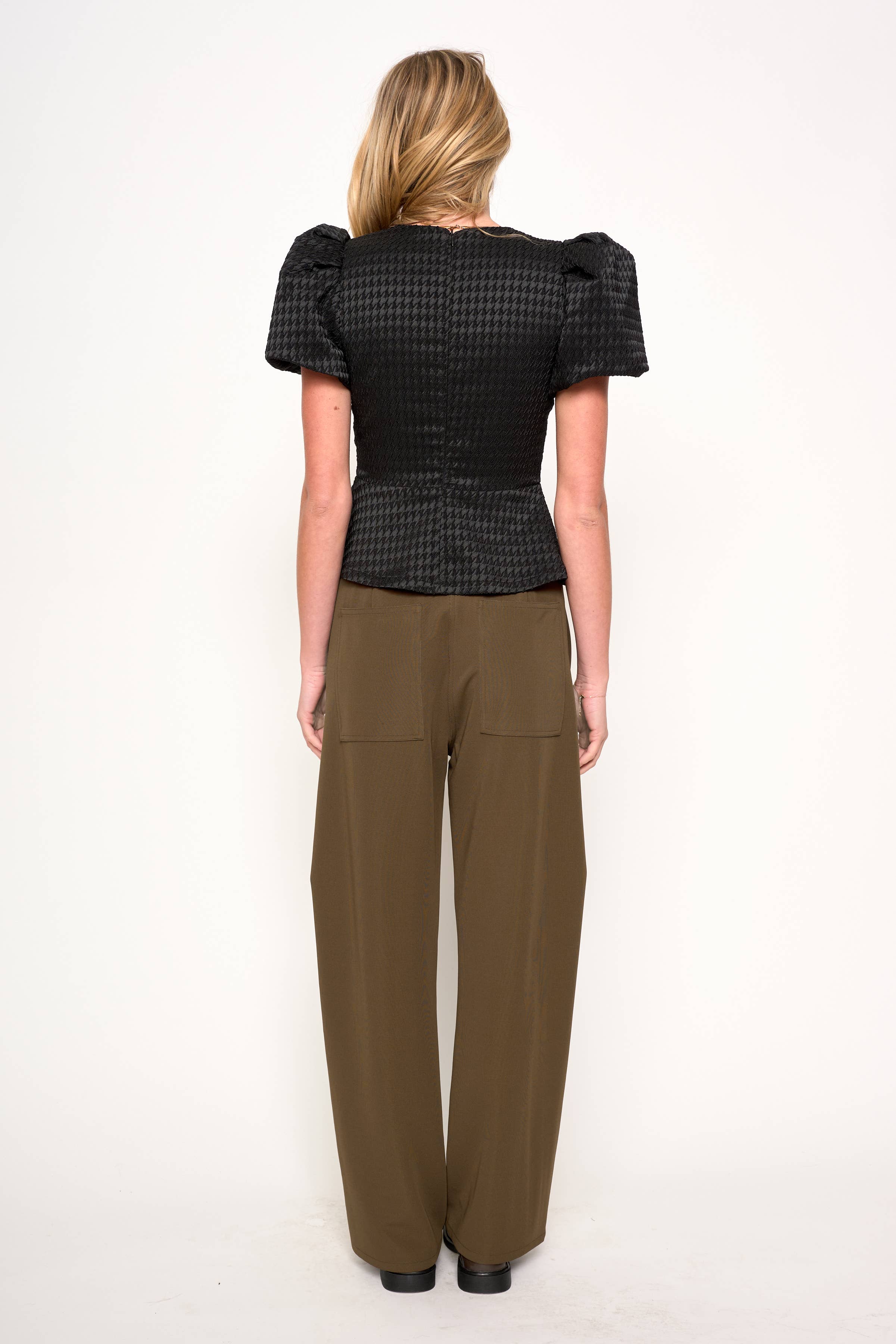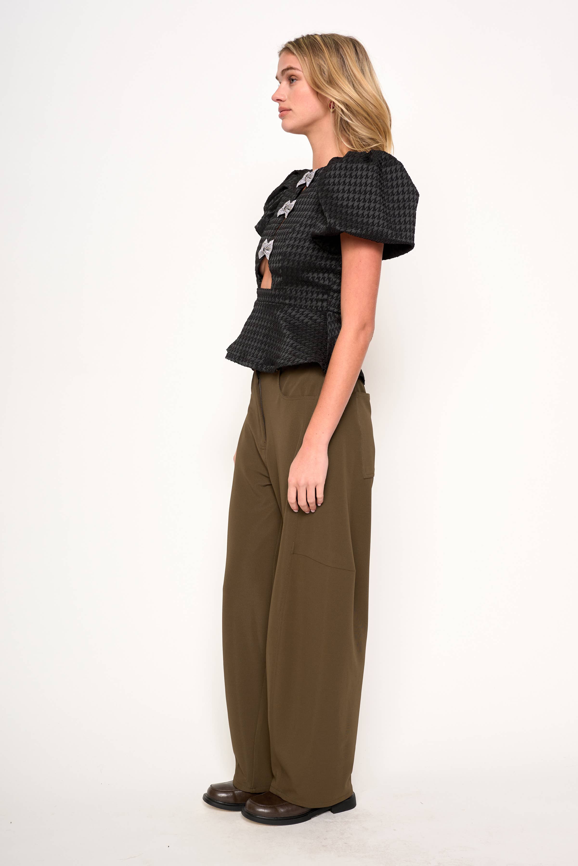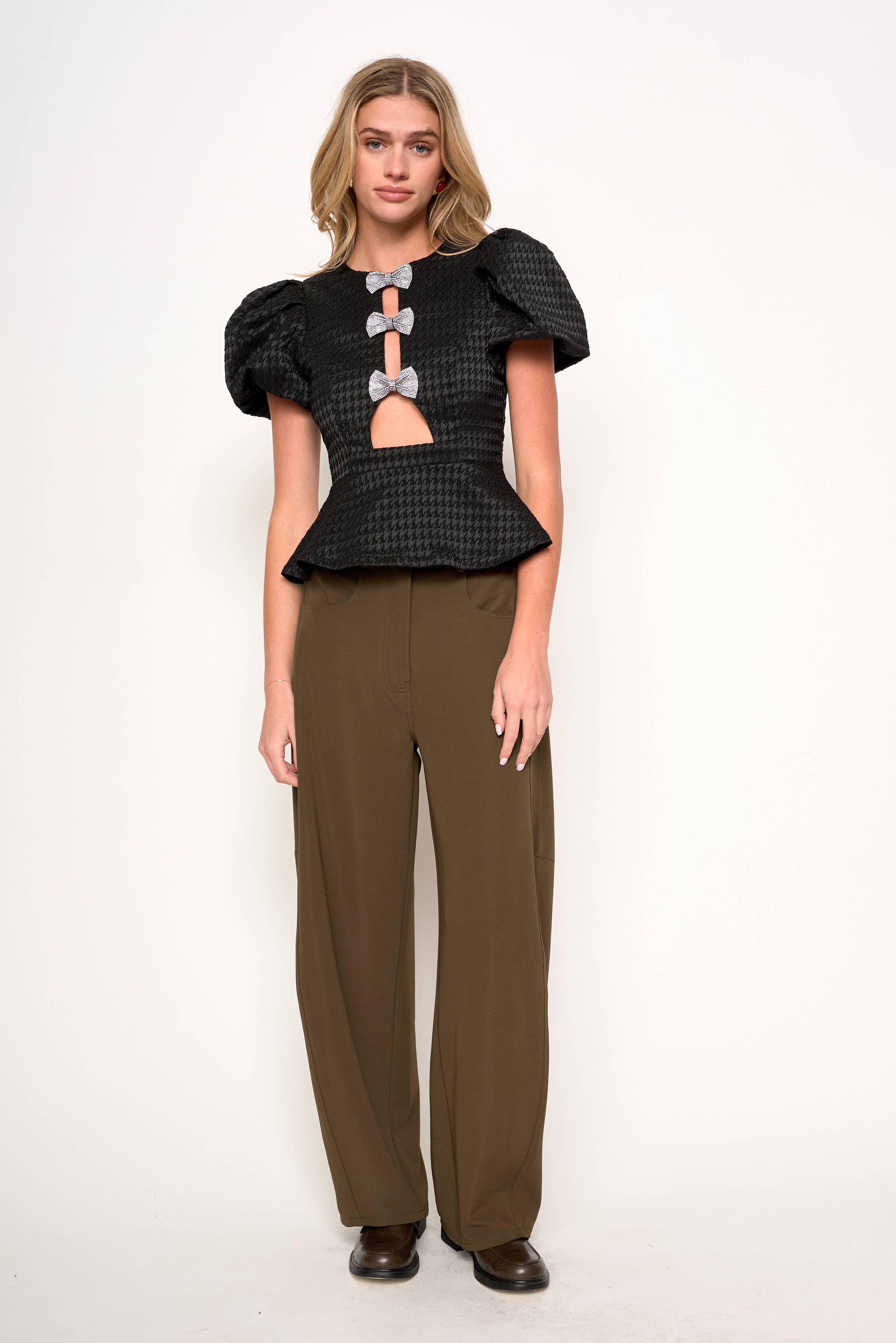 A modern ode to moody romance, the Super Trooper Top stuns with every detail. Crafted from textured black fabric in a sculpted silhouette, it features voluminous puff sleeves, a flared peplum hem, and a trio of glittering bows that bloom along the front cutouts like midnight blossoms. Feminine yet fearless, it’s made for candlelit dinners, rooftop nights, and main character moments.