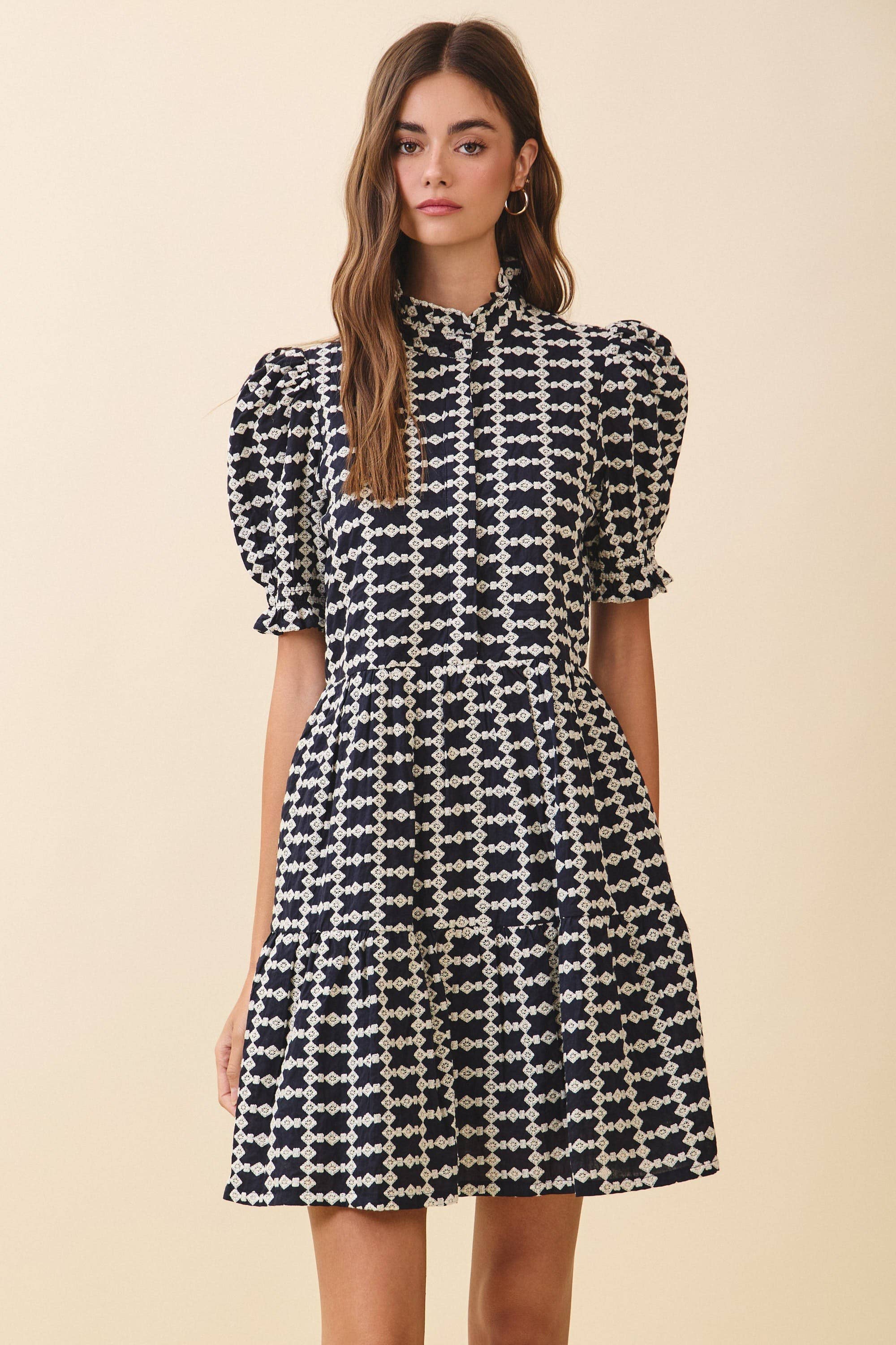 A geometric printed mini dress featuring a front hidden button placket, mock neckline, and short puff sleeves with ruffled cuffs. Designed with a tiered skirt that creates a softly flared silhouette.