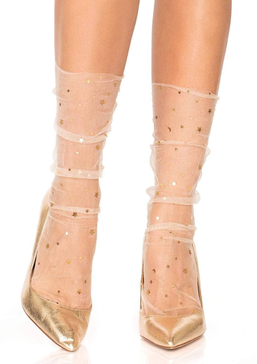 For a look that's out of this world, look to the Charli Stars and Moons Socks by Leg Avenue. A surefire favorite, these ankle socks are adorned with delicate stars and moons against a sheer tulle night sky. These socks are the perfectly dainty finishing touch to any outfit! * Package includes: Pair * High quality stocking fabric for long lasting wear * Beautiful sheer tulle material * Gently twinkling stars and moons give these sheer socks a subtle shine * Reinforced toes * Perfect fit technology * Wear with everything from sneakers to heels! * Hand wash cold, Do not bleach, Drip dry