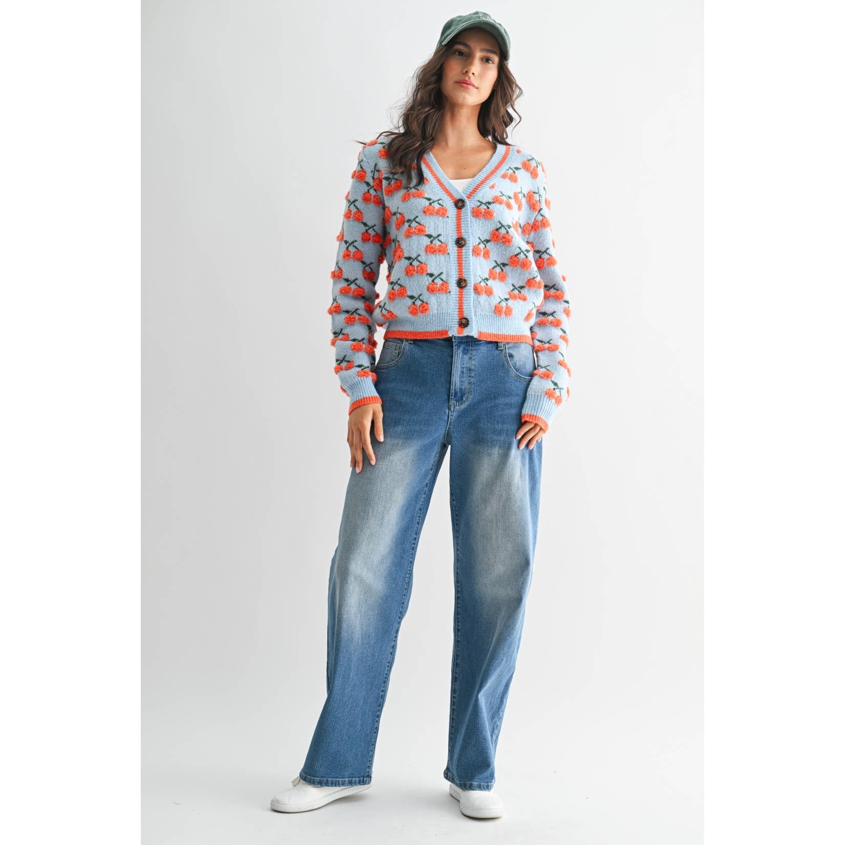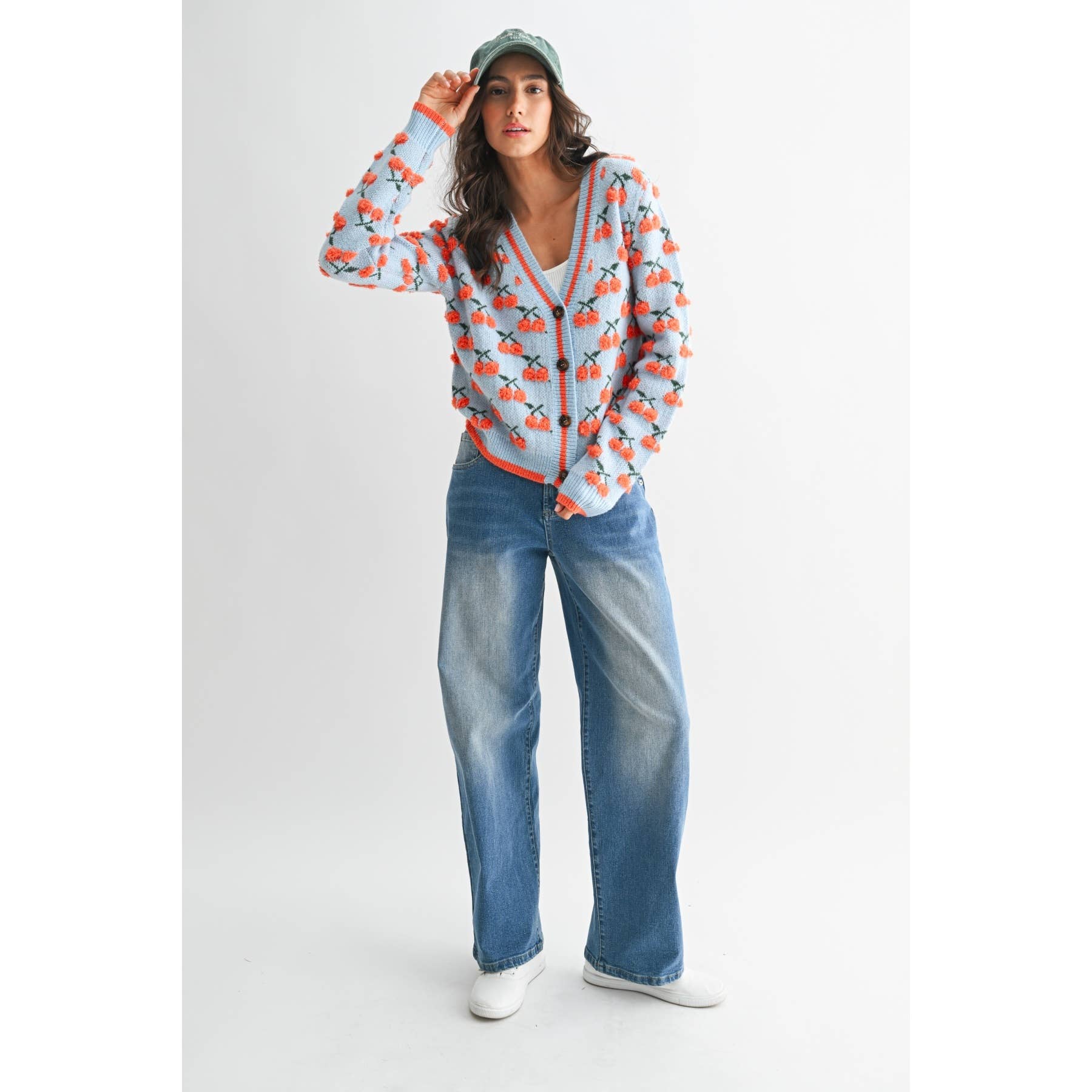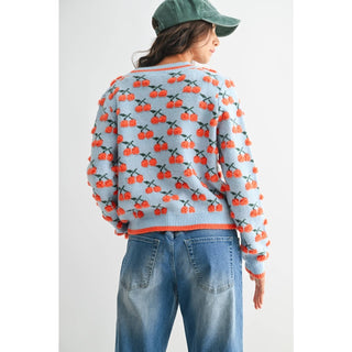 A nod to countryside charm and café-side style, the Cerise Jolie Cardigan is as delightful as a Parisian spring. Adorned with vibrant cherry embroidery on a soft sky-blue knit, it features a classic V-neckline, bold contrast trim, and just the right amount of whimsy. Pair it with high-waisted denim or a flouncy skirt for a look that says je ne sais quoi in the sweetest way.
