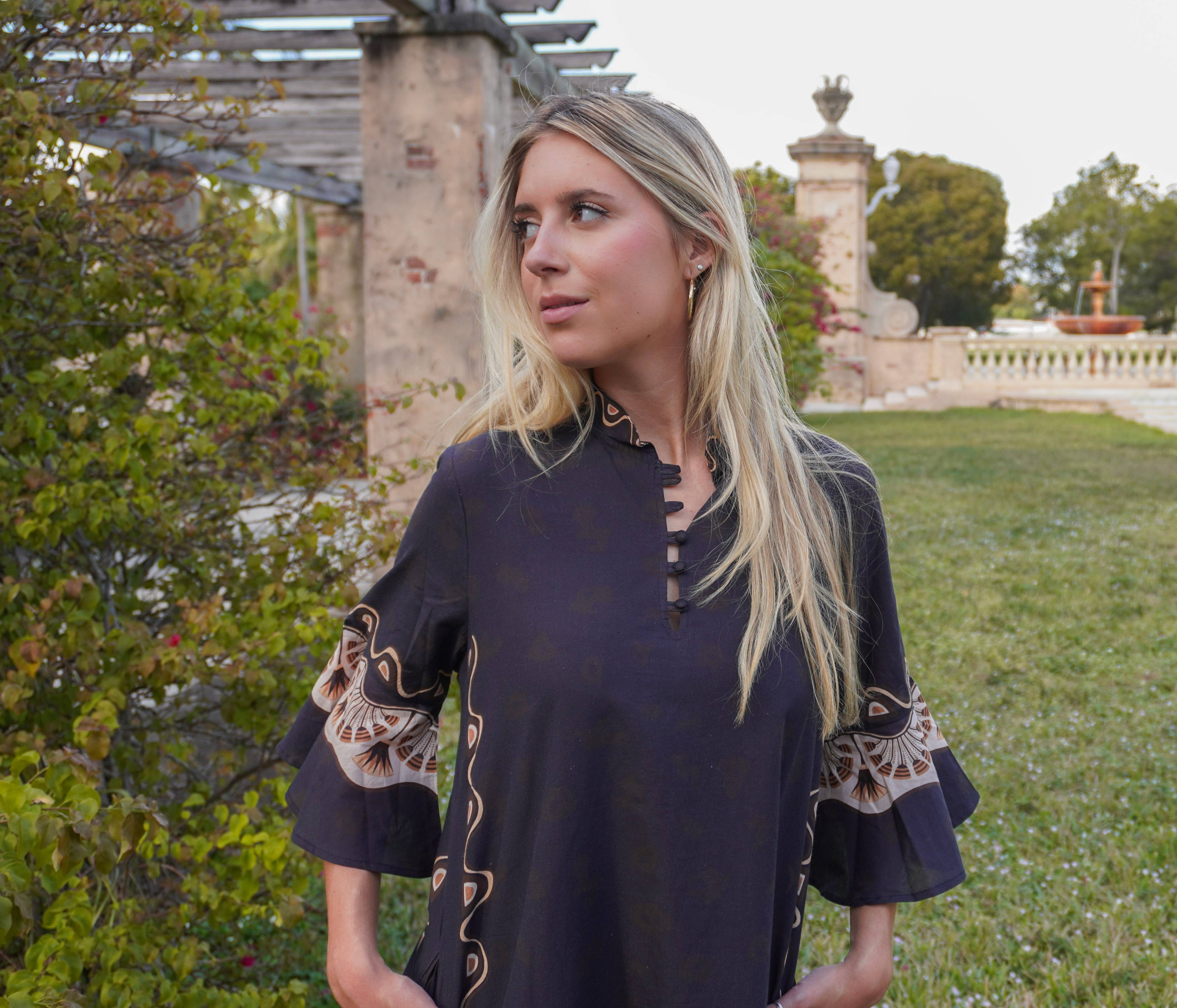 Channel effortless wanderlust in the Savanna Stroll Midi — a statement piece that marries relaxed elegance with exotic artistry. Crafted in deep indigo with soft golden undertones, this flowy dress features intricate border detailing and a majestic hand-painted leopard motif along the hem. The notched neckline and flared sleeves lend a touch of bohemian ease, while hidden pockets make it as practical as it is chic. Perfect for sunset dinners, art-filled afternoons, or simply embracing your wild side in style.