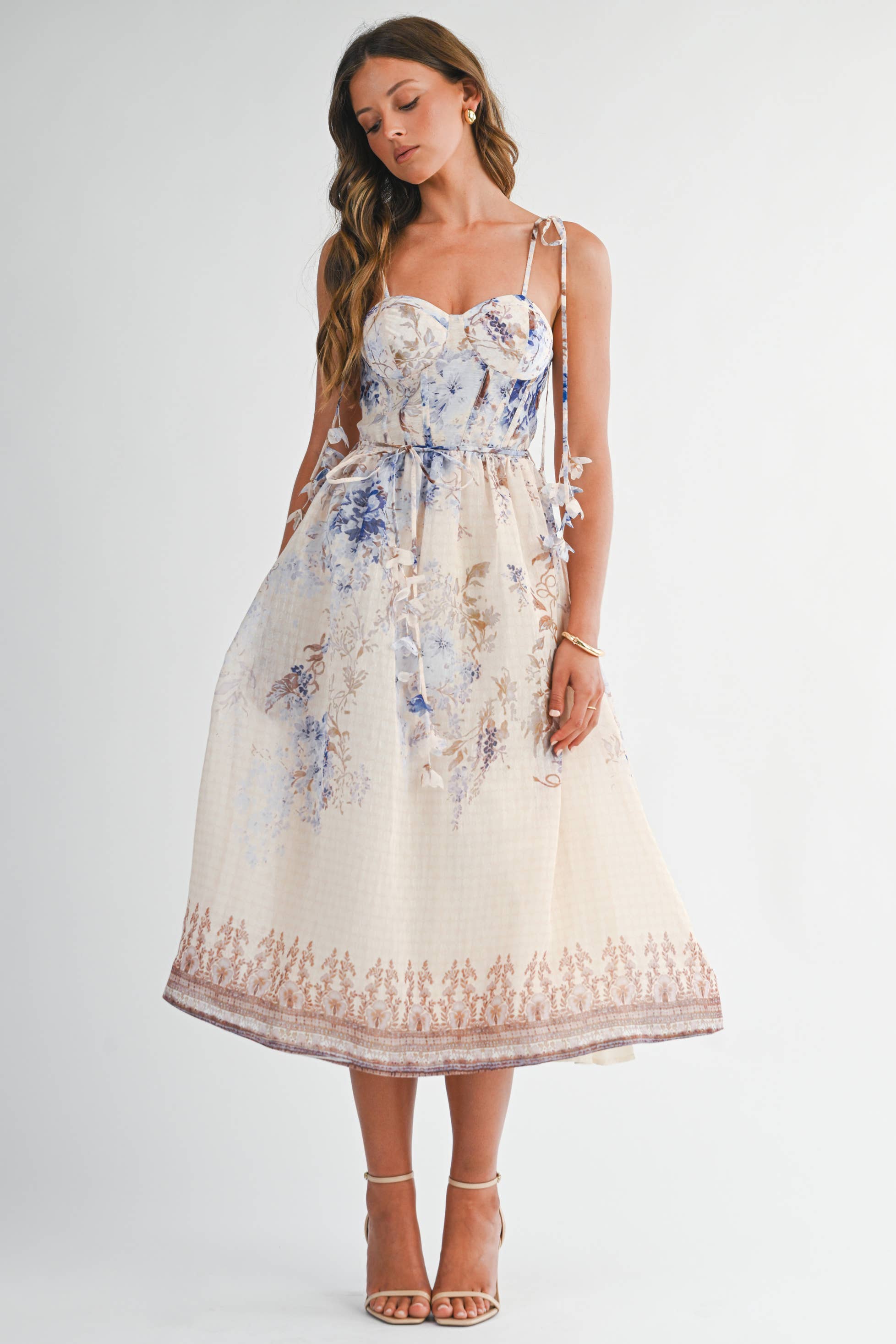 An ode to vintage elegance, the Giardino Dress channels the spirit of an Italian summer garden. Crafted in a gossamer floral fabric with a corset-style bodice and delicate tie straps, it evokes timeless femininity and refined allure. The soft pleating and border print create fluid movement, while the painterly blooms recall Gucci’s archival florals. Romantic yet polished, it’s the kind of dress that lingers in memory — graceful, luminous, and meant for golden hours spent among roses and champagne. Whether you're dressing it up with heels or keeping it romantic with flats, this piece is the epitome of feminine grace.