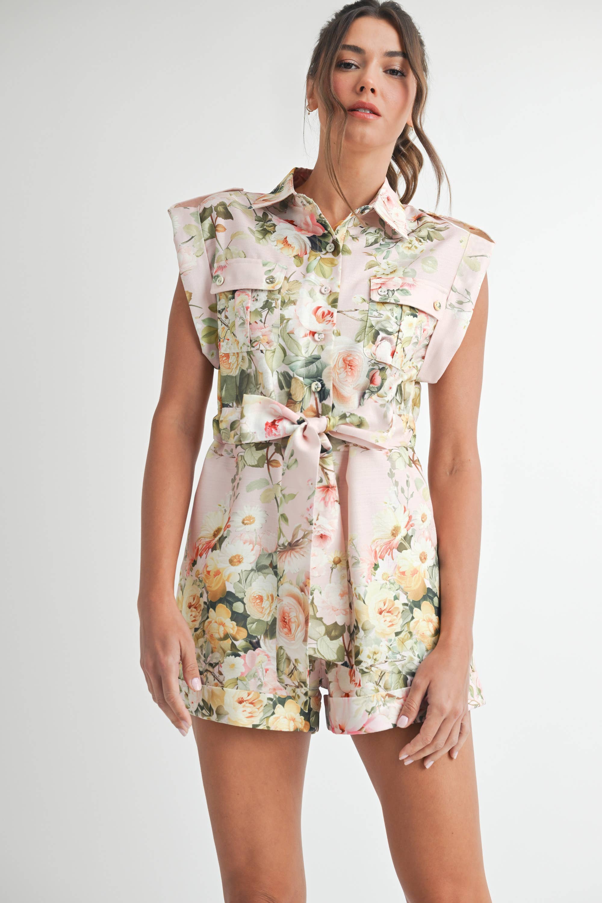 A vision of sunlit femininity, the Primavera Romper blooms with painterly florals in soft blush, butter, and sage hues. Designed with sculpted shoulders, a belted waist, and delicate tailoring, it captures that effortless balance of structure and ease. The collared neckline and romantic garden print evoke vintage Italian summers — where linen curtains dance in the breeze and afternoons linger a little longer. Pair with woven slides or strappy heels for a look that’s endlessly graceful and unmistakably refined.