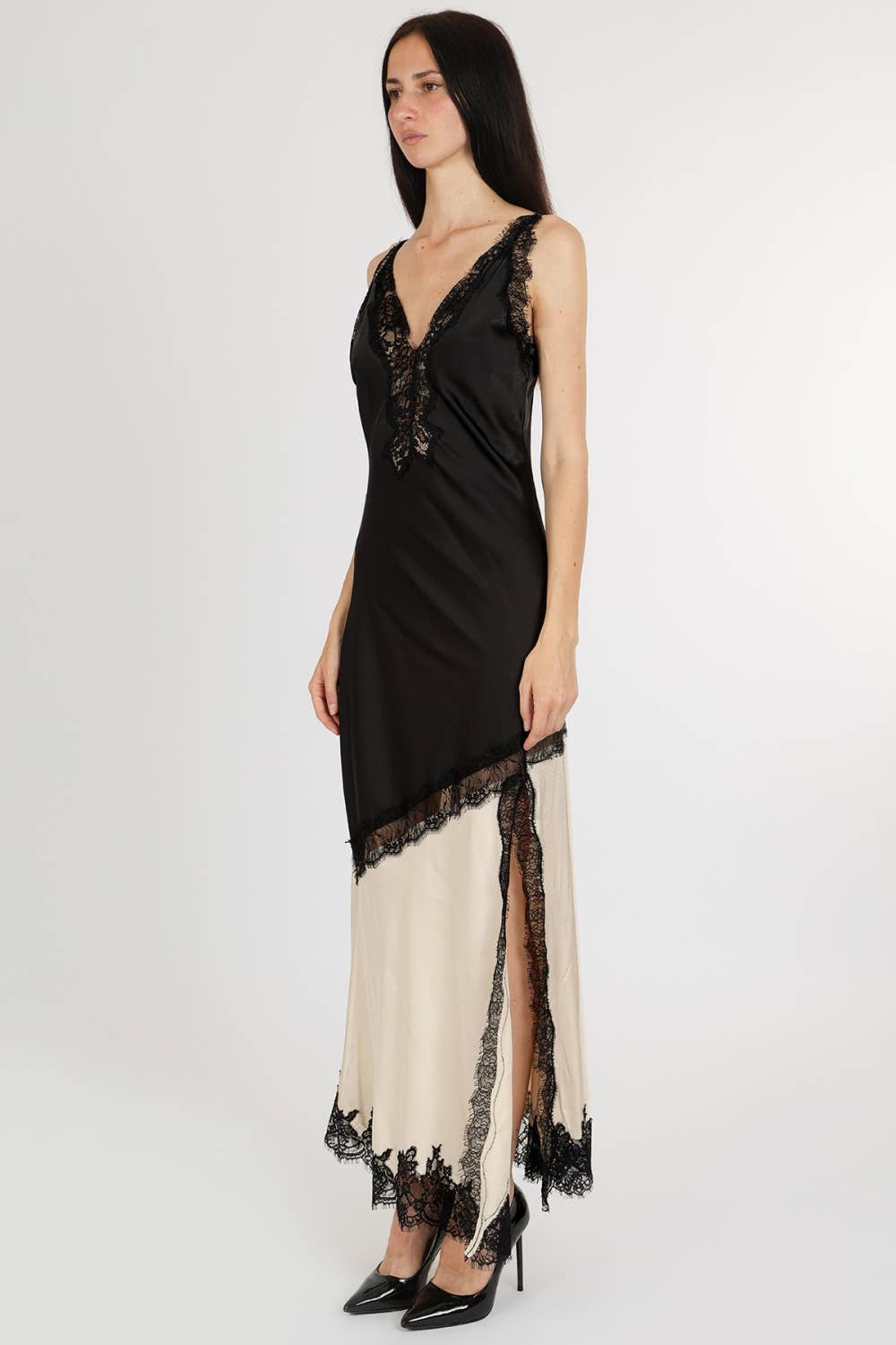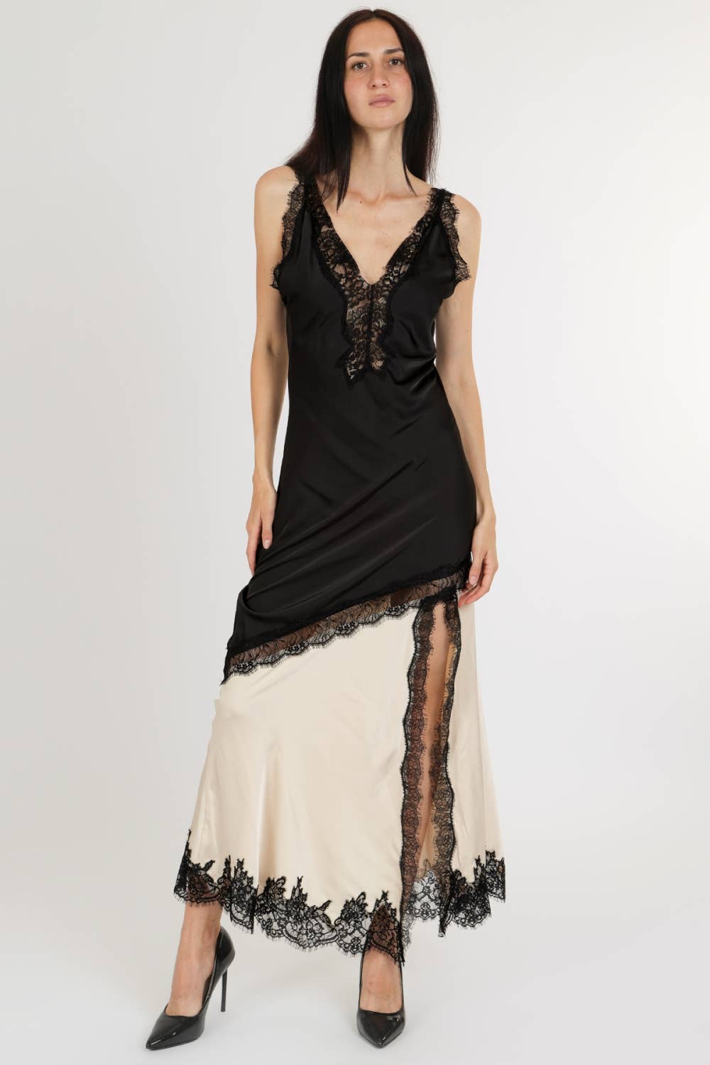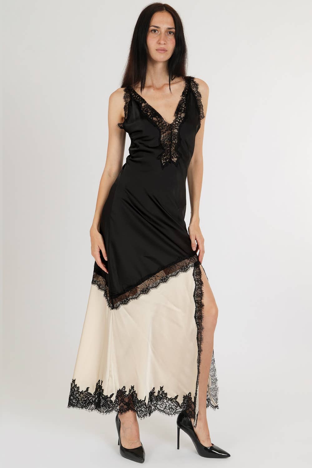 The Nocturne Lace Gown is a sultry play on contrast and elegance. Crafted in a satin-like finish, the silhouette cascades effortlessly with a daring asymmetrical design—black on top melting into ivory at the hem. Delicate scalloped lace trims the plunging neckline, slit, and sweeping hemline, adding an intoxicating edge to its refined drape. With its lingerie-inspired allure and fluid movement, this gown is perfect for evenings where sophistication meets seduction.