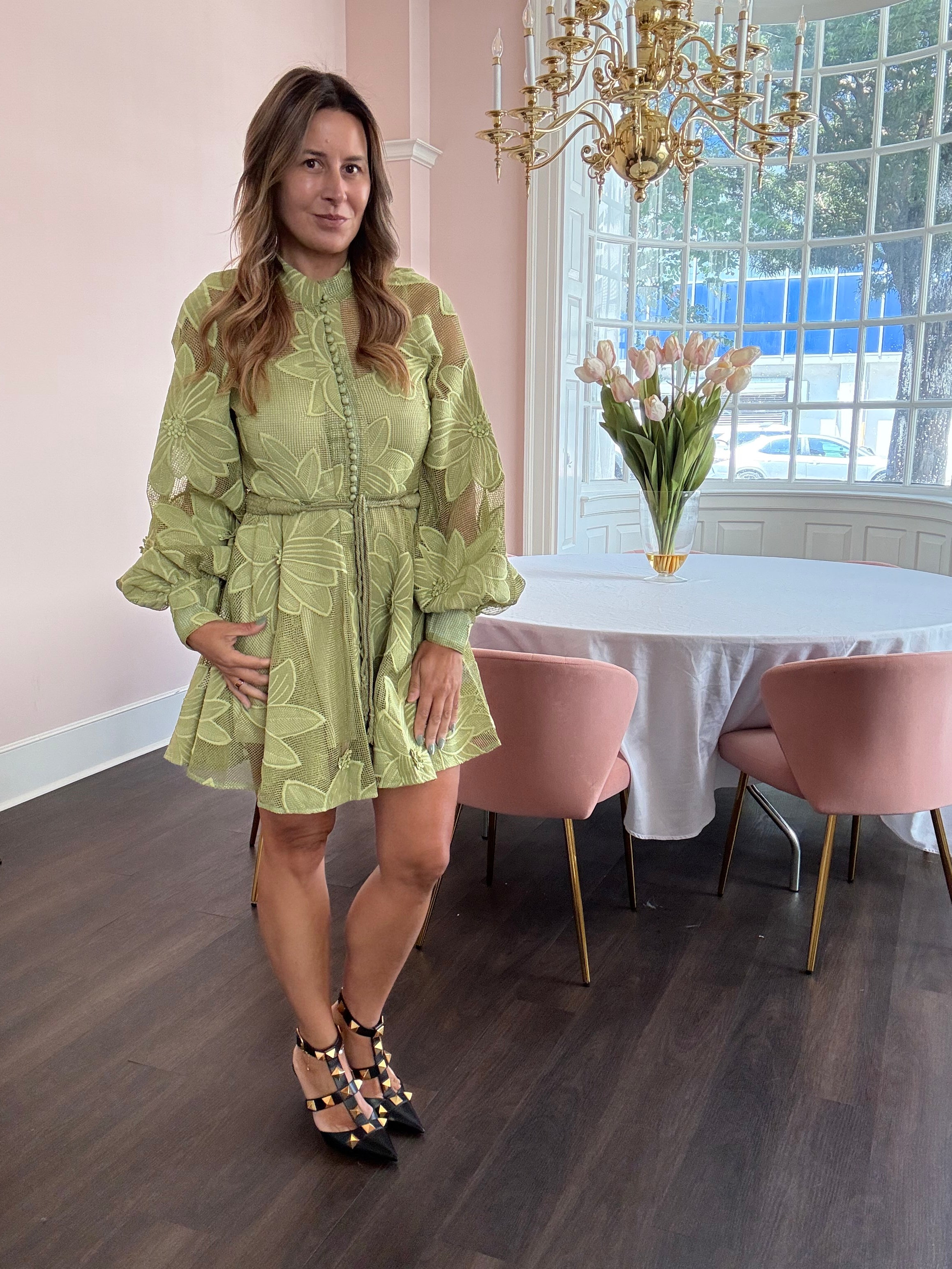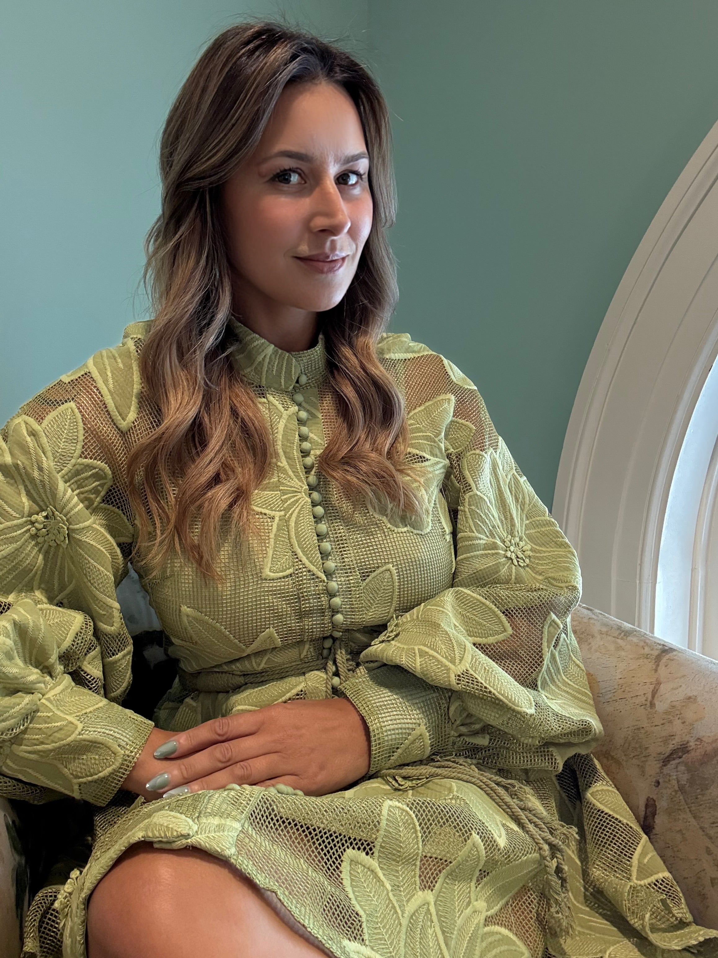 The Sage Palais Dress exudes refined elegance, crafted in a delicate sage hue with oversized floral embroidery that feels both modern and timeless. Sheer mesh panels and covered button detailing create an architectural balance of structure and softness, while the braided tassel belt cinches the waist for a flattering, feminine silhouette. Finished with voluminous sleeves and intricate textural accents, this piece is designed for soirées, garden affairs, and moments where understated luxury speaks volumes.