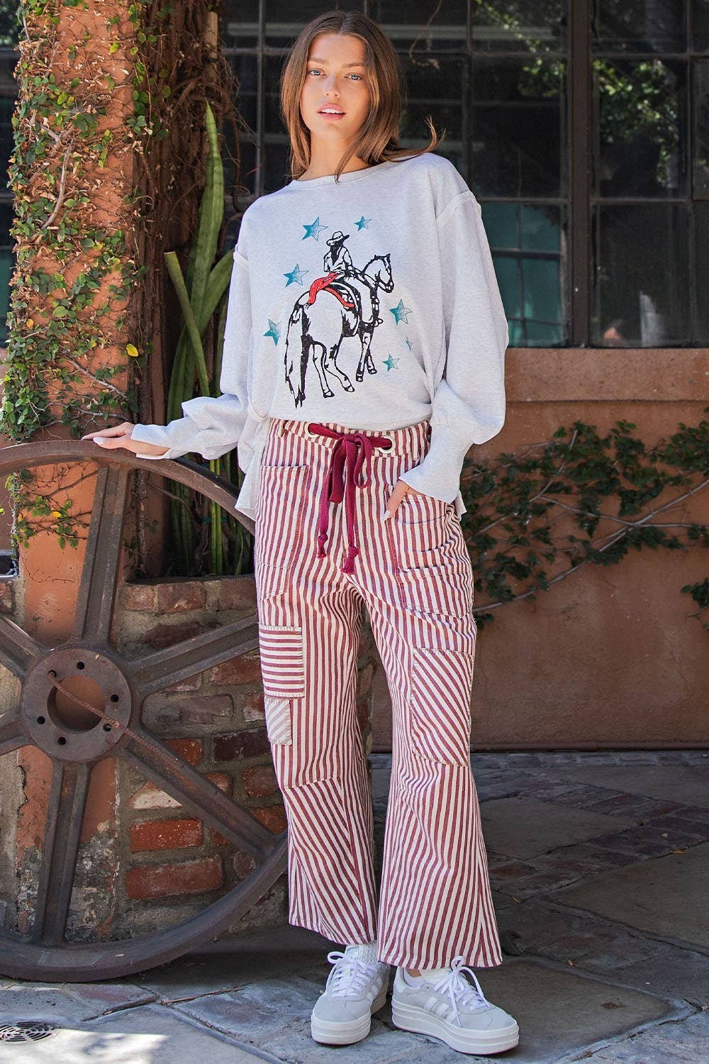 Effortlessly cool and endlessly versatile, the Sienna Stripe Cargo Pant brings a touch of coastal utility to your everyday style. Featuring bold cinnamon-and-cream stripes, oversized patch pockets, and a relaxed wide-leg fit, these pants are made for spontaneous adventures and laid-back weekends alike. The adjustable drawstring waist adds comfort with a hint of edge, while the lightweight woven fabric gives them that breezy, lived-in feel. Pair with a simple tank or cropped sweater for a look that’s both relaxed and refined.