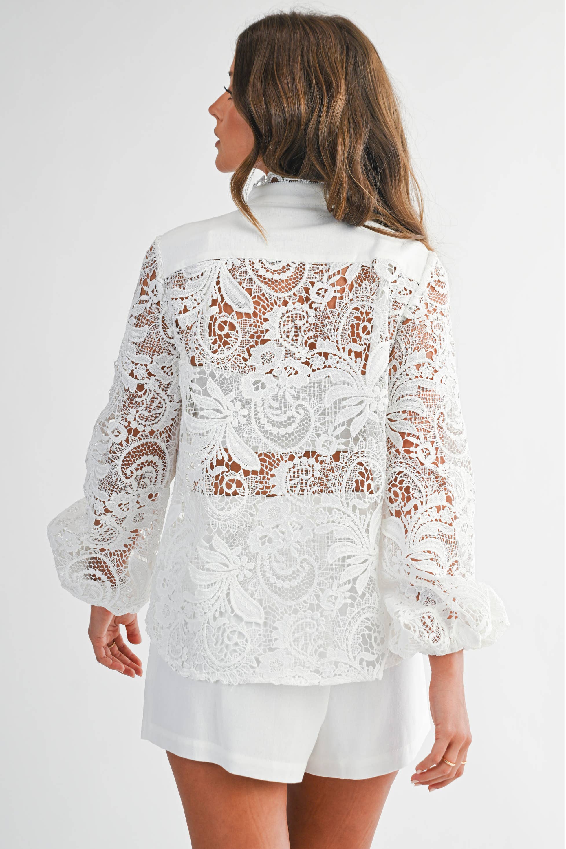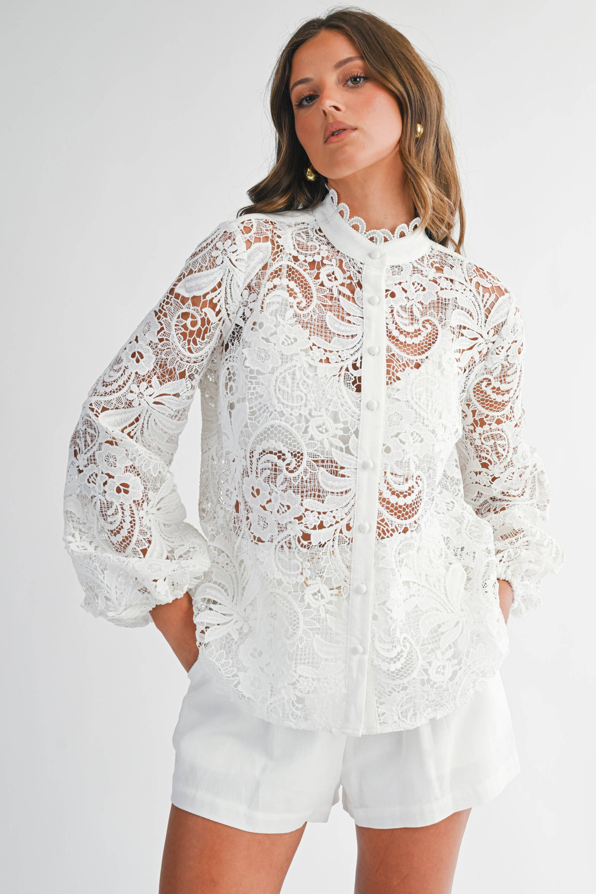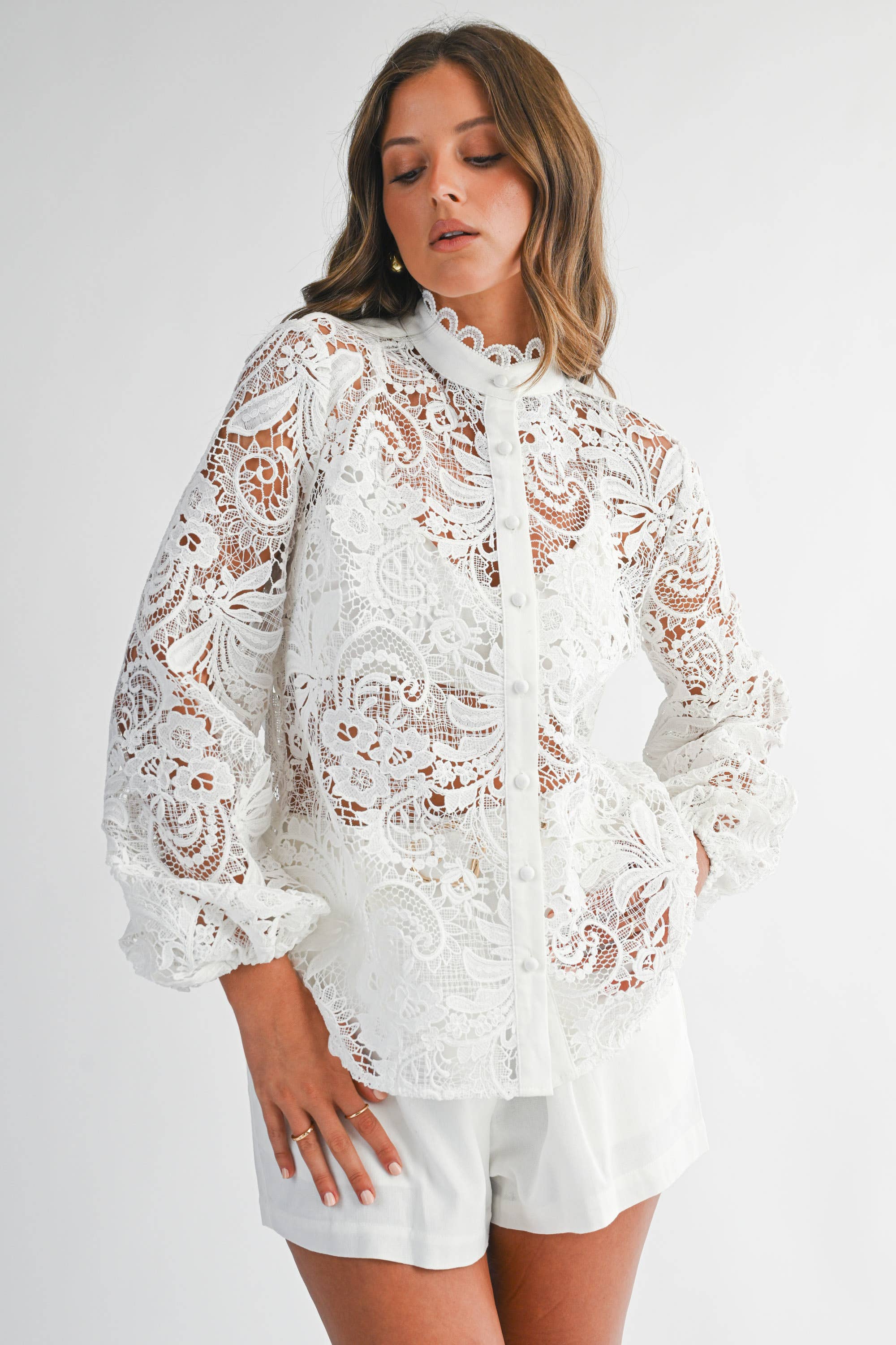 Add instant sophistication to your wardrobe with this chic lace blouse. Designed with intricate floral lace and a high scalloped neckline, this top brings both romance and polish to any look. The sheer lace detailing, covered button-down front, and voluminous sleeves with elastic cuffs create a feminine yet modern silhouette. Perfect for desk-to-dinner styling, it pairs effortlessly with trousers, skirts, or tailored shorts.