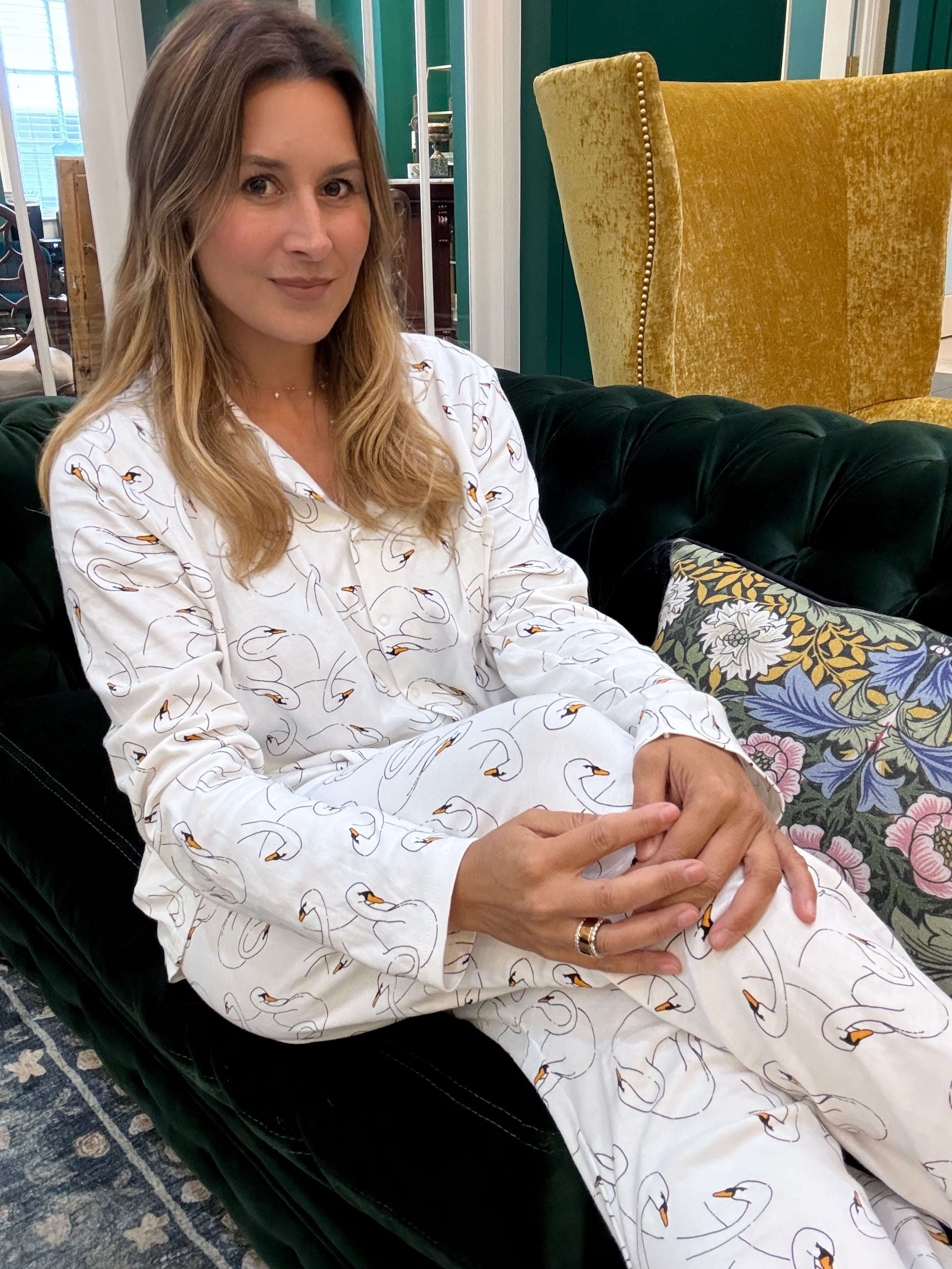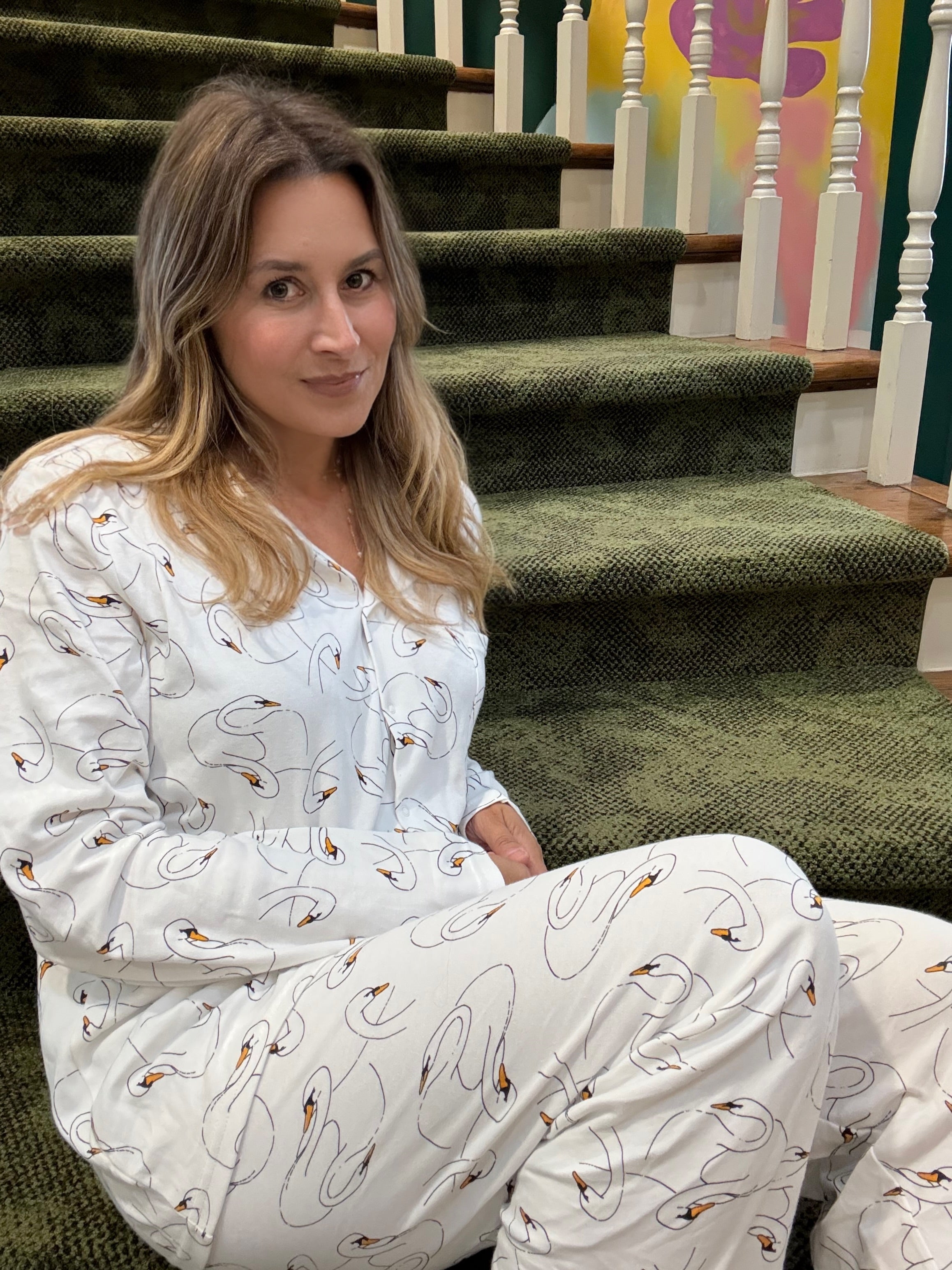 Graceful as a swan’s glide, the Swan Song Pajama Set brings a touch of poetry to your evenings. Crafted from 100% soft organic cotton and adorned with a dreamy hand-drawn swan motif, these pajamas evoke a serene elegance perfect for slow mornings or winding down in style. With its classic button-down silhouette and relaxed fit, it’s loungewear made for those who believe even rest should feel romantic.