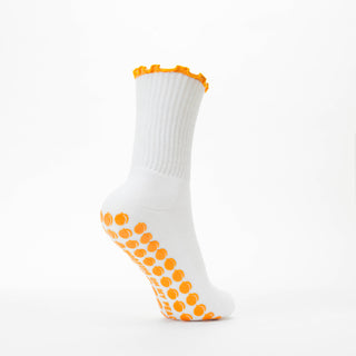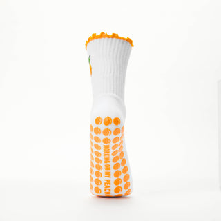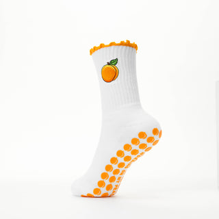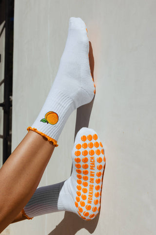 Our new 'Working on my Peach' Grip Socks will be the cutest thing to walk into your Pilates, Barre or Workout Class. Our grip socks are made with a cushioned sole so you will workout in both comfort and style. Featuring the words "Working on my Peach" with Peach Shaped Grips on the sole.