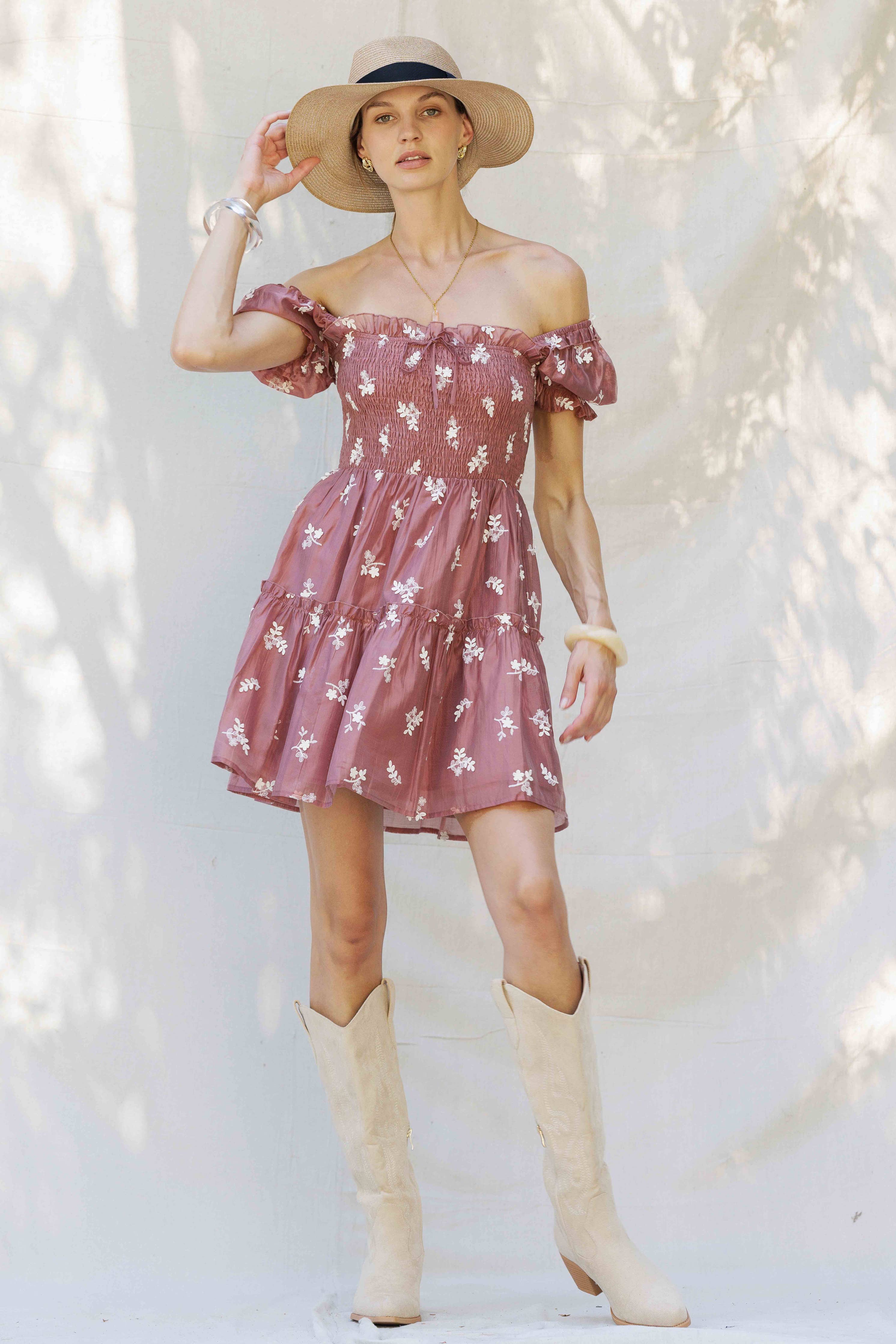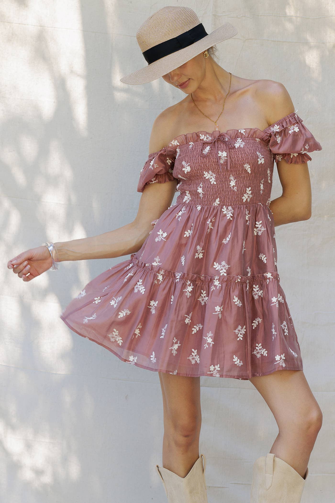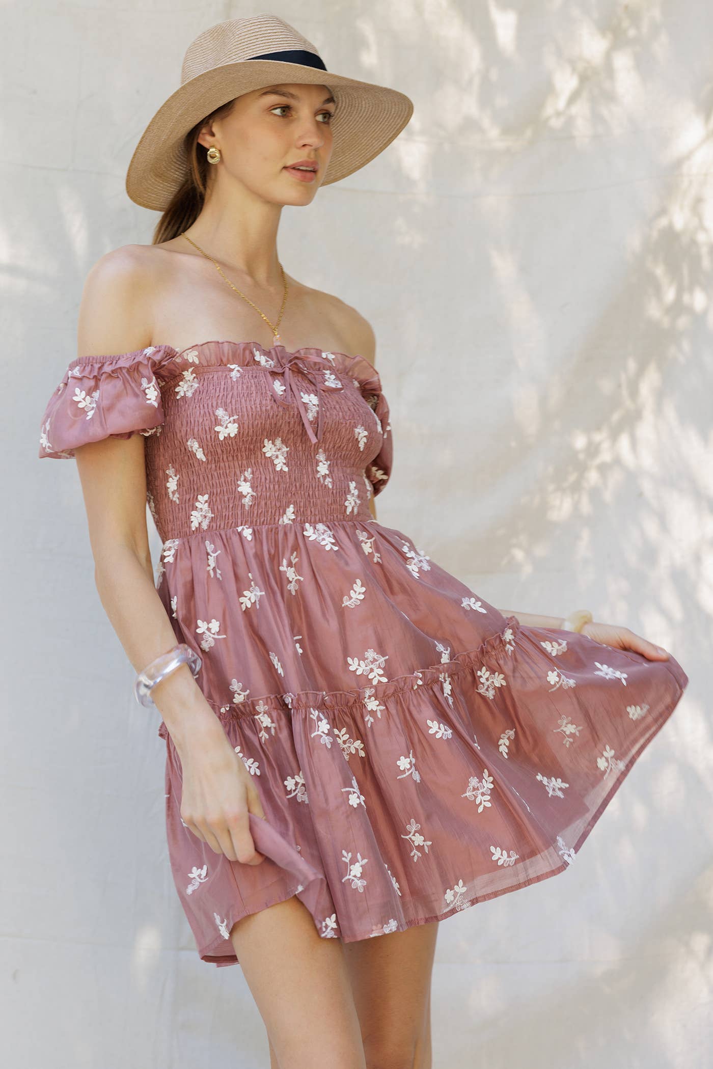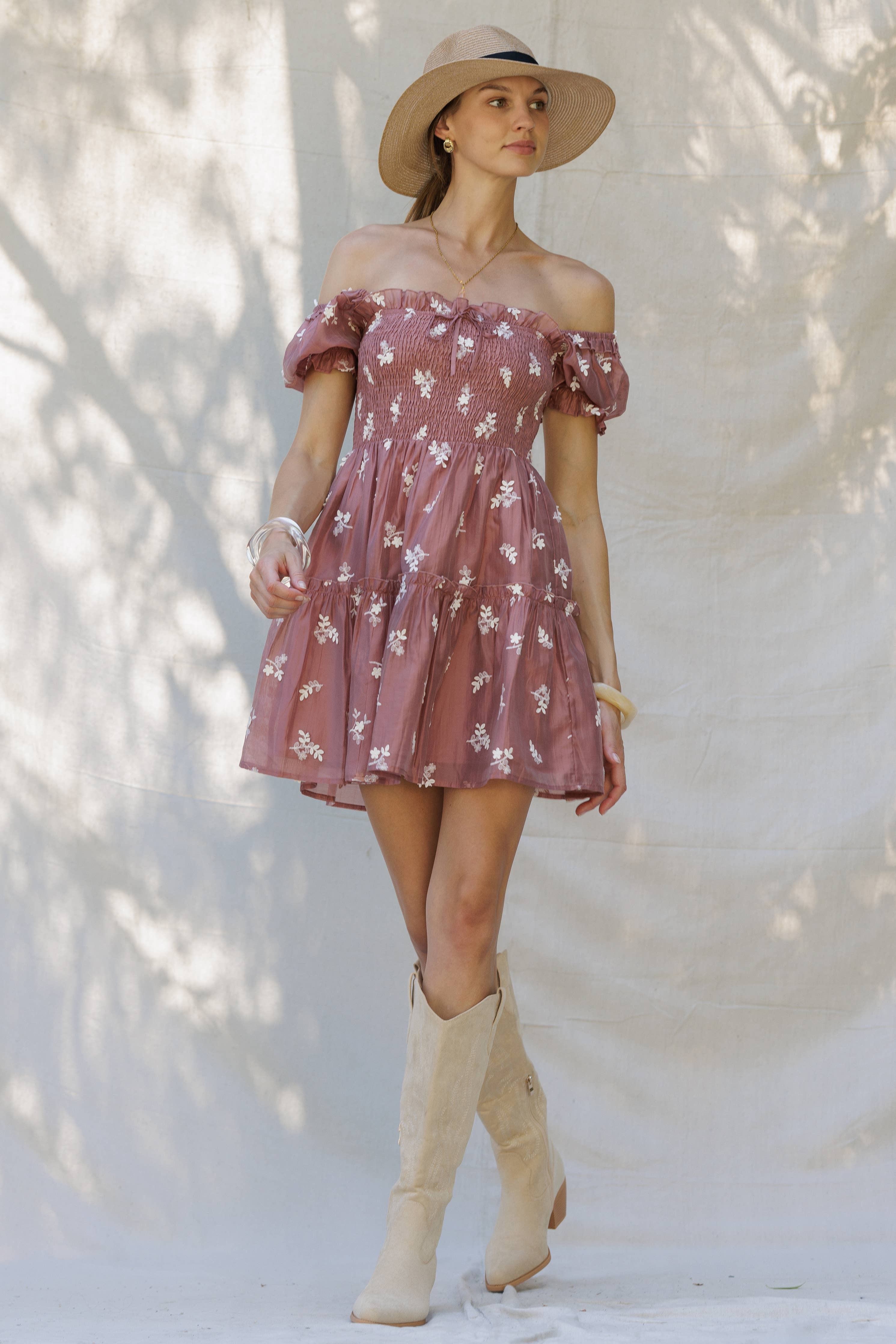 Romantic, airy, and meant for sun-drenched days, the Rosette Bloom Mini Dress blends effortless charm with delicate detail. The smocked bodice offers a flattering, comfortable fit, while the off-the-shoulder neckline and soft ruffle trim add a touch of feminine sweetness. Scattered white floral embroidery drifts across the rosy fabric, creating a light, whimsical texture that moves beautifully with every step.